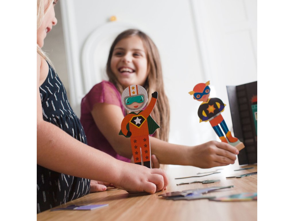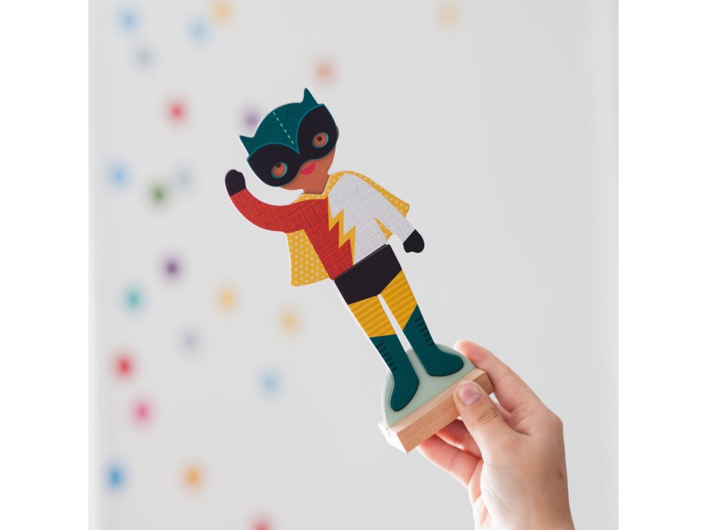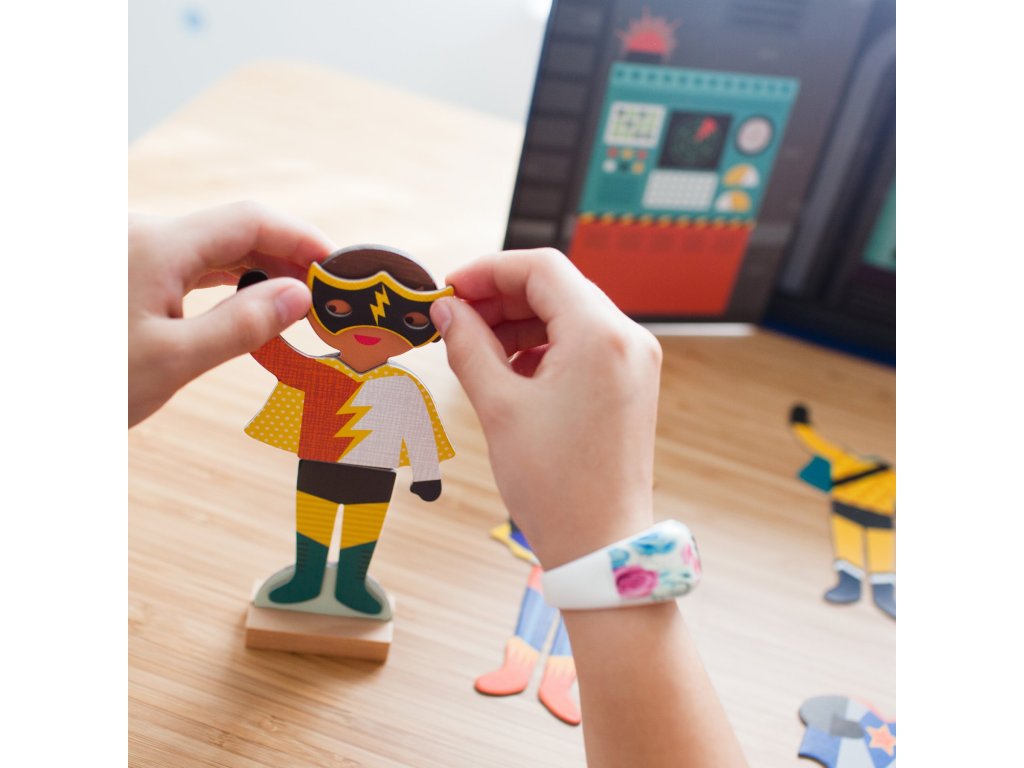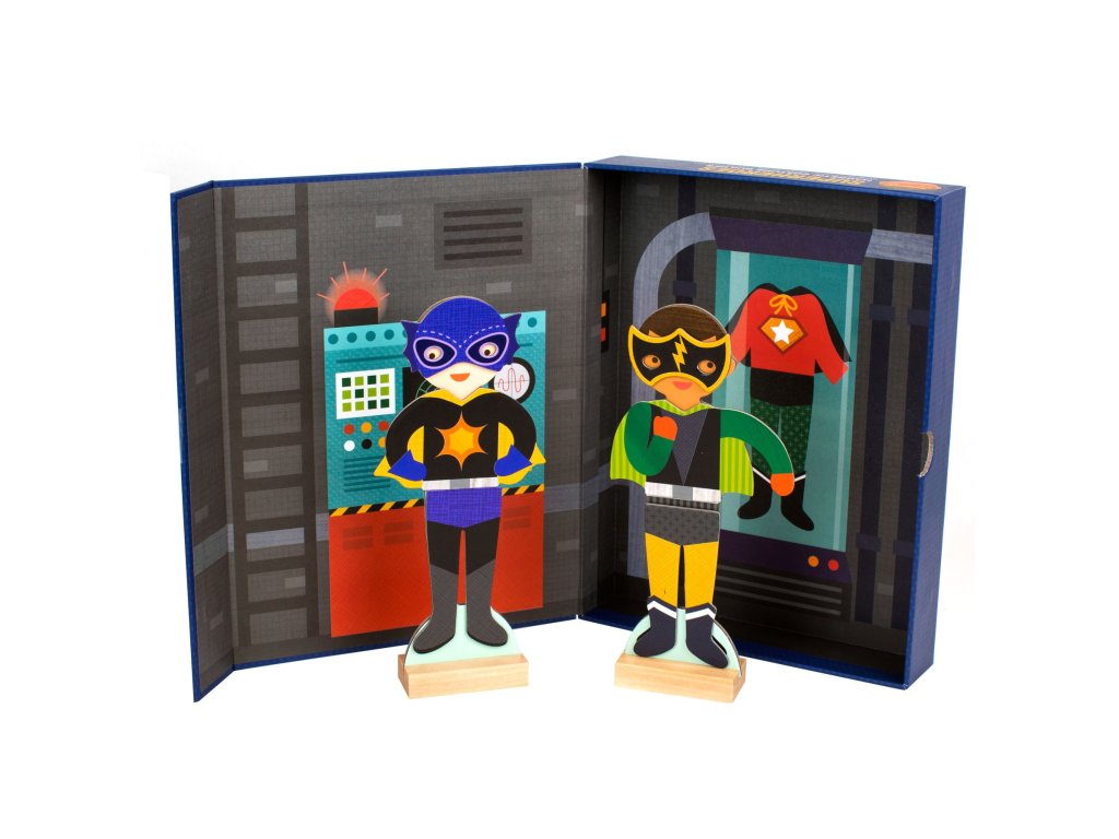 Sada superhrdinů v krabičce uzaviratelné magnetem s 27 ks magnetických částí vytváří až 80 různých kreativních kombinací převleků pro superhrdiny. Obsahuje 2 velké superhrdiny a 2 dřevěné stojánky. Hlavní vlastnosti: 2 velcí superhrdinové2 dřevěné stojánky