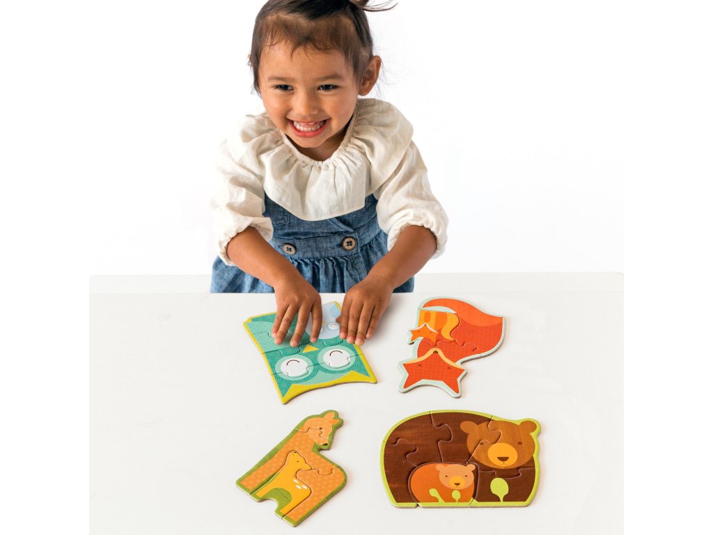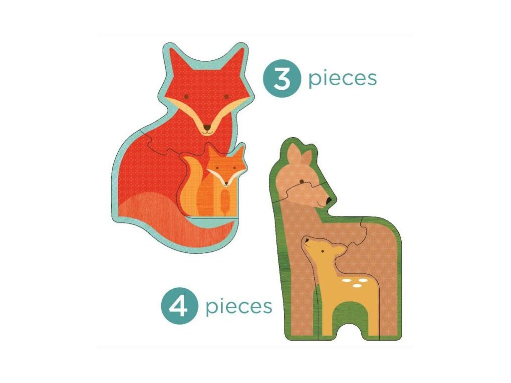 Skládačky o 3, 4, 5 a 6 kusech. Sada puzzle obsahuje 4 motivy lesních zvířátek. Vyrobeno z recyklované lepenky a potištěné rostlinnými barvami. Hlavní vlastnosti: 4 motivy lesních zvířátekVyrobeno z recyklované lepené a potištěno rostlinnými inkoustyÚložný box pro snadné uschování