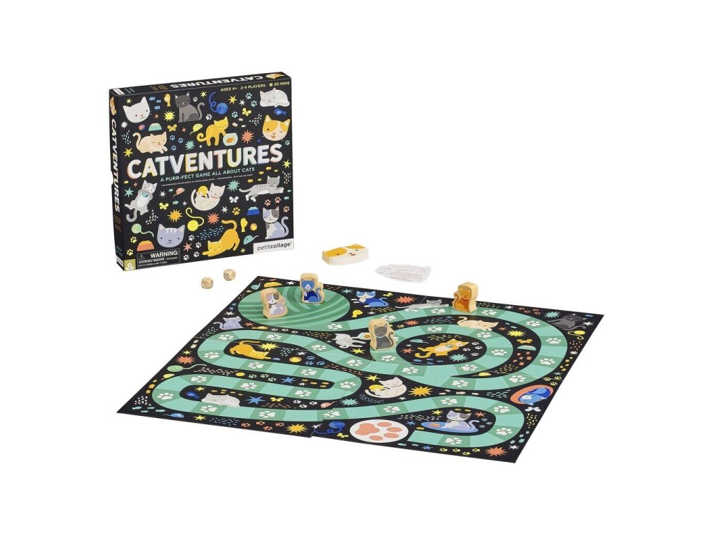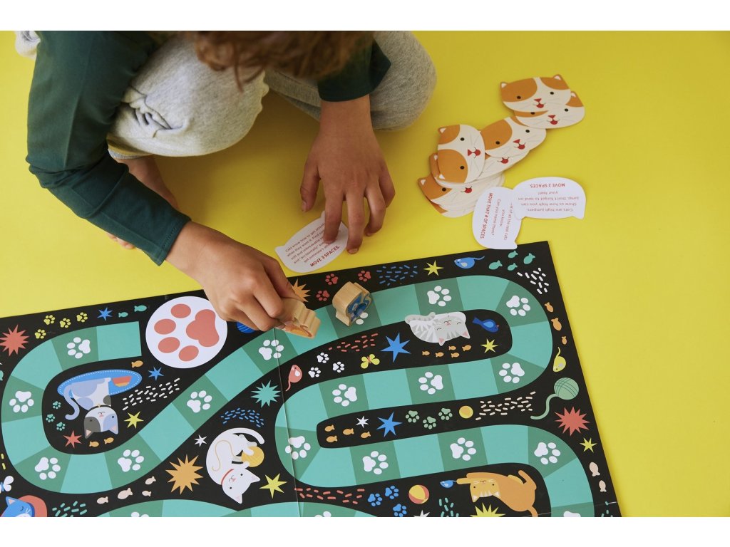 Tato krásná stolní hra otestuje vaše vědomosti o kočkách a jejich dobrodružstvích! Budete plnit některé z 51 úkolů, jako kočky! Vyberte si svou kočičí figurku a můžete začít hrát. Vyhrává ten, kdo jako první vkročí na klubíčko. Obsahuje 1 hrací desku, 4 figurky, 1 dřevěnou kostku, 51 kartiček s úkoly v angličtině, španělštině a francouzštině. Hlavní vlastnosti: obsahuje herní desku, kostku, 4 figurky, 51 kartiček s úkoly ve 3 jazycíchnatištěno rostlinnými barvami dřevěné figurky Zkrácený návod hry:Začíná hráč, který jako poslední v nedávné době pohladil kočku. První hráč hodí kostkou a posune se o počet polí, dle hodnoty hozené na kostce. Pokud stoupne na políčko s kočičí packou, vezme si kartu a splní daný úkol. Splňte úkol a posuňte se o počet polí, který je uveden na kartě. Pokud hráč nemůže splnit úkol z karty, položí ji na odkládací balíček, textem nahoru. Na řadě je další hráč. Hra pokračuje, hráči se na tazích střídají dle určeného pořadí. Házejte kostkou, posouvejte figurky, berte si kartičky dle pacek a plňte úkoly. Pokud jste použili všechny kartičky, jednoduše zamíchejte odkládací balíček a hra může pokračovat.