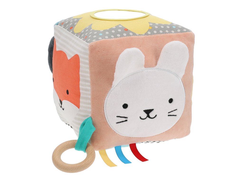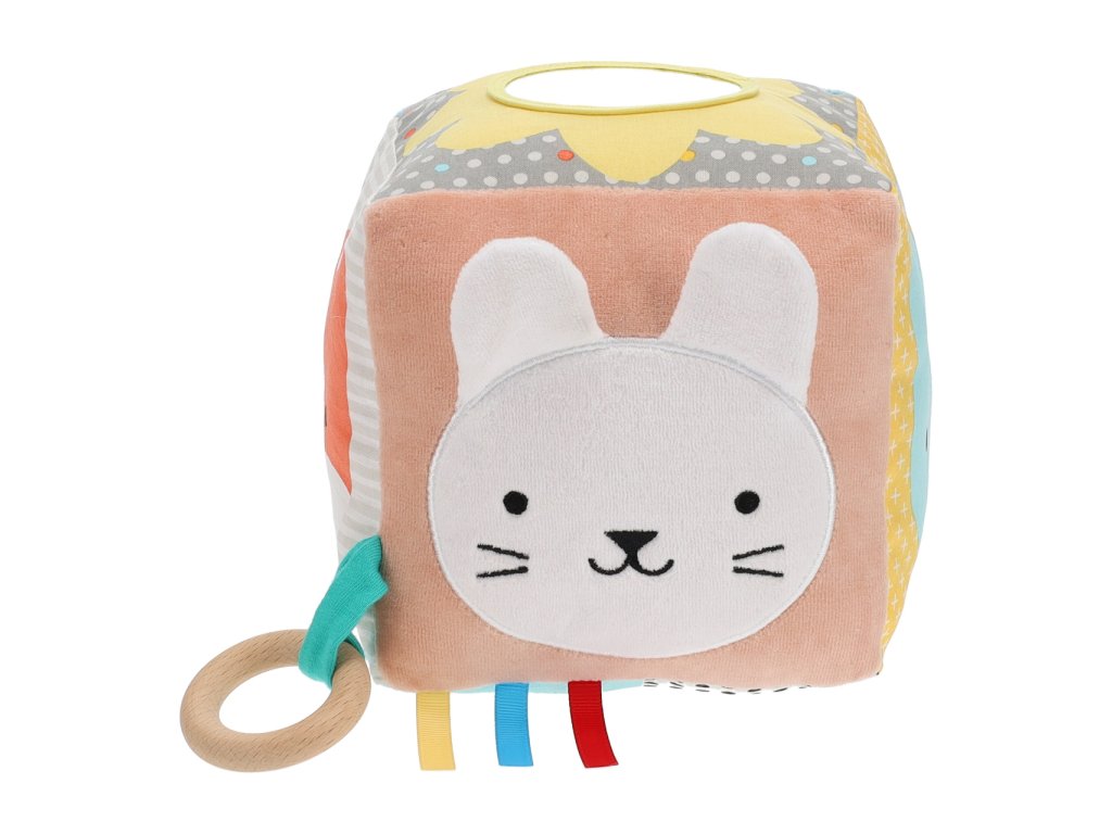 Měkká a hebká kostka provedením stimuluje hmat nejmenších. Je vyvedena v kontrastních barvách a vybavena rolničkou, aby poutala pozornost. Na stěnách jsou vyobrazeny přátelské obličeje zvířátek, které stimulují zvědavost vyčnívajícími oušky. Kostka je také vybavena zrcátkem, dozdobena několika stuhami a vybavena dřevěným kroužkem sloužícím jako kousátko. Je vyrobena z organické bavlny a plněná materiálem z recyklovaných plastových lahví. Hlavní vlastnosti: měkké a hebké provedeníobsahuje rolničku, zrcátko a kousátkonízká hmotnost