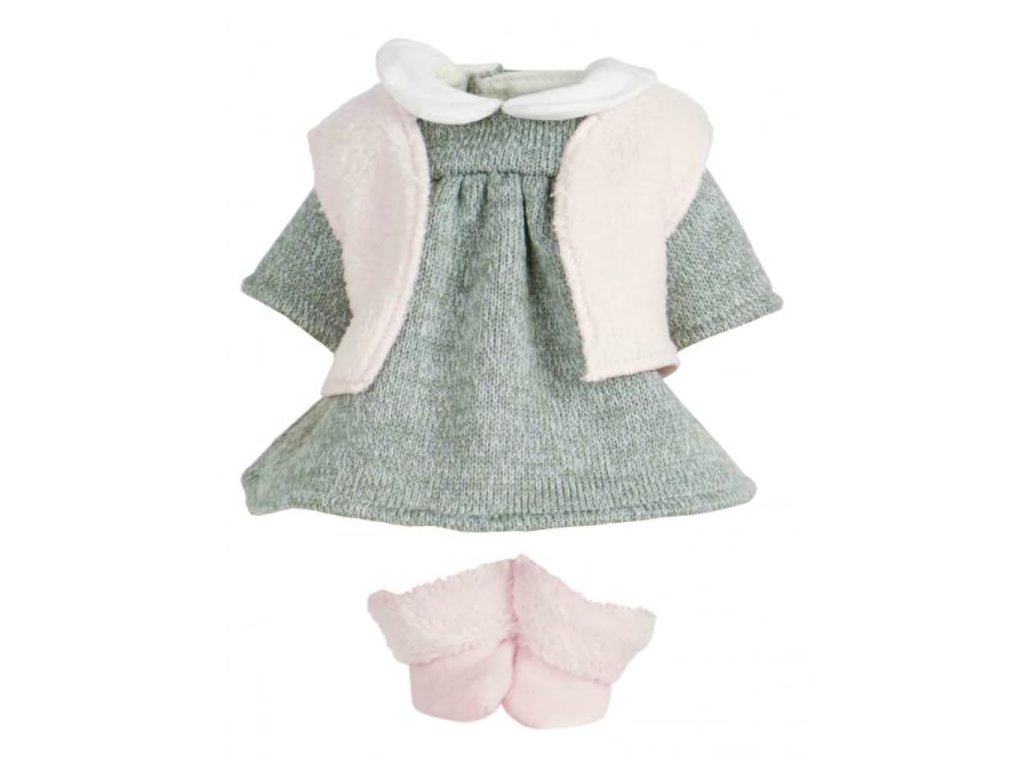 Obleček určený zejména pro panenky Petitcollin řad Écolo Doll, Bébé d'amour, Câlinette a Petit Câlin odpovídající velikosti. Skládá se z šedobílých zimních šatiček, růžové vestičky a páru teplých růžových ponožek. Oblečky Petitcollin jsou pečlivě zpracované, vynikají francouzskou elegancí, jedinečnou barevností a vzory, díky kterým jsou poutavé a nezaměnitelné. Dodáváno v papírové krabičce s průhledem a plastovým ramínkem. Hlavní vlastnosti:pro panenky o výšce 28 cmšatičky, vestička a ponožkyvyrobeno v Tunisku