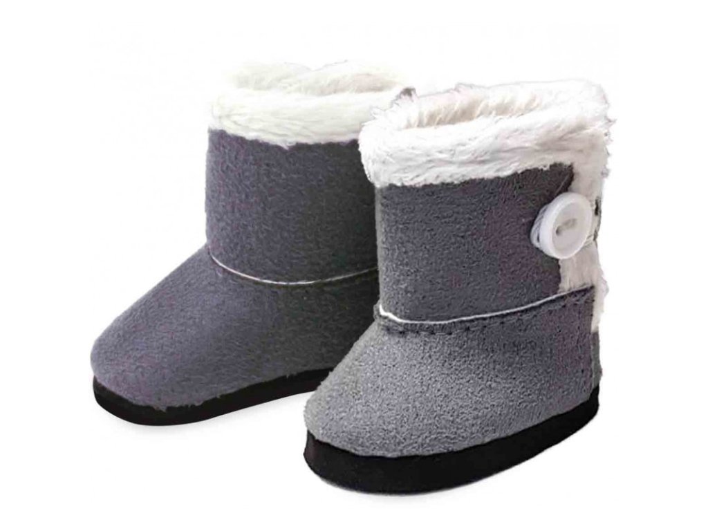 Pár šedých kožešinových zimních botiček zdobených knoflíčkem určený zejména pro panenky Petitcollin řad Écolo Doll, Petit Câlin, Bébé d'amour a Câlinette. Dodáváno v uzavíratelném plastovém sáčku. Hlavní vlastnosti:pro panenky o výšce 28 cm