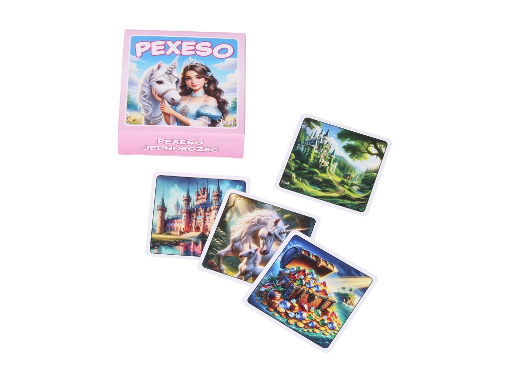 Pexeso Jednorožec v krabičce. Balení obsahuje 64 karet (32 párů) + 2 karty s pravidly. Rozměr krabičky 8x8x2,5 cm.