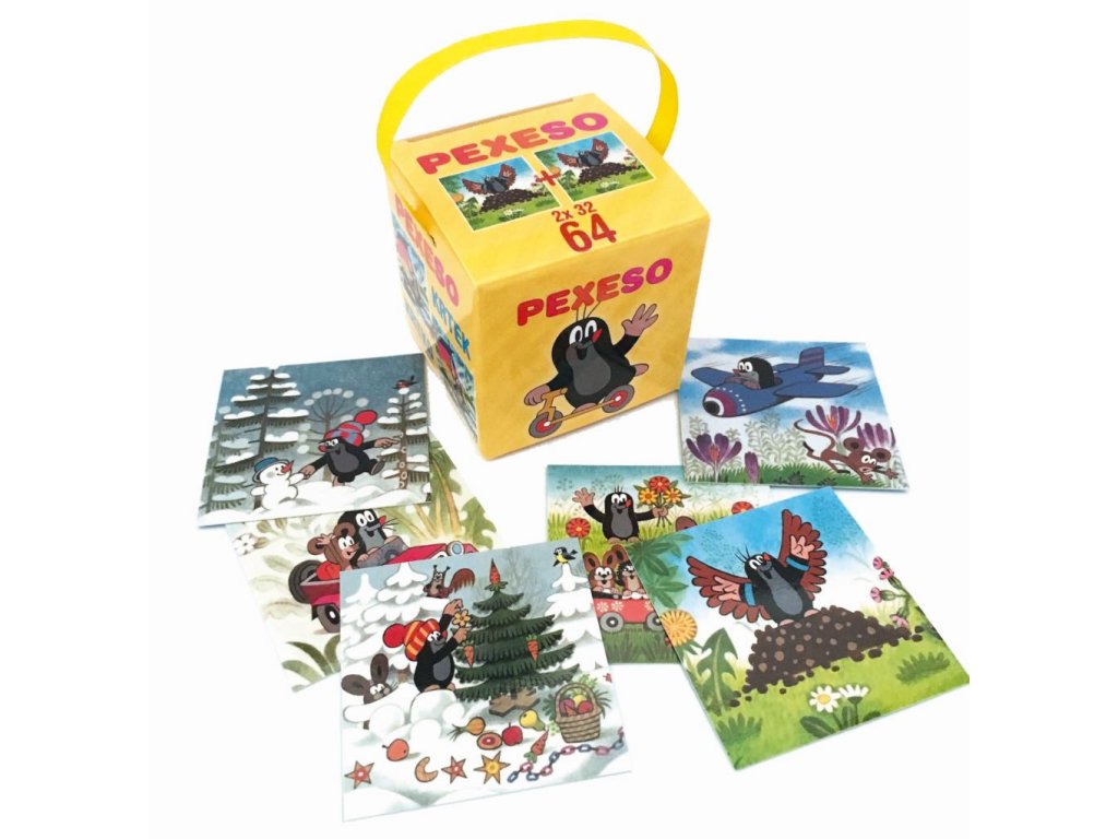 64 KARTIČEK , materiál krabičky i kartiček pevný karton s lesklou voděodpudivou povrchovou úpravou, krabička opatřena stuhou pro úchop dětskou rukou, velké obrázky- hra vhodná i pro nejmladší hráče- snadné zapamatování, snadná manipulace, na výrobek byla udělena ocenění "česká kvalita" a "bezpečná a kvalitní hračka"
