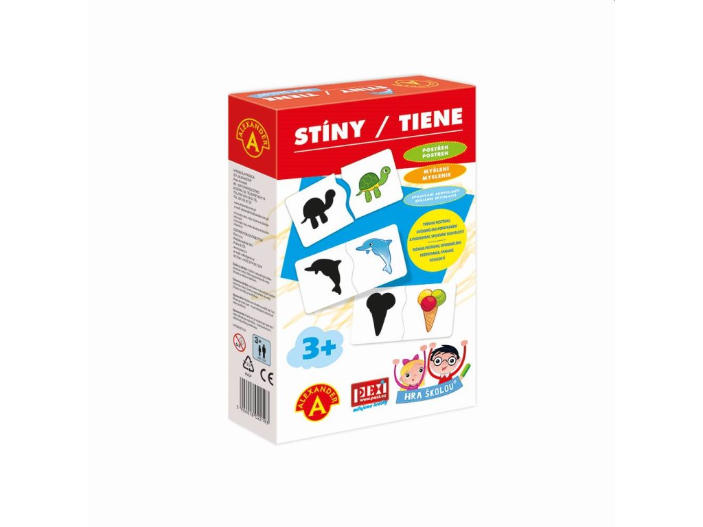 Hra školou Stíny je kreslená naučná stolní hra pro děti od 3 let rozvíjí kombinační schopnosti, pozorování a postřeh. Sestav a poznej 24 dvojic složených ze stínu a barevného obrázku zvířat, hudebních nástrojů a věcí z každodenního života. Poznáš zvířátka nebo hudební nástroje jen podle obrysu? Sestav 24 párů jako puzzle a pokračuj ve hře. Oblíbená hra z edice Hra školou®. Zábava i pro maminky a tatínky. Jak vypadá obrys kachněte? V čem se liší od kuřátka? Váháte? Poznávejte svět společně! Kolik nápadů, tolik variant. Jak dítě poroste, stane se hra čím dál zábavnější. Pro nejmenší (od 3 let) Nechte dítě složit dvojice a prohlížet si obrázky. Střední obtížnost: Ukazujte si konkrétní zvířata, hudební nástroje a věci z obrázků a povídejte si o nich. Zvídavé otázky pro chytré hlavičky: Ptejte se a společně zjišťujte třeba: Kolik zvířátek najdeš mezi motivy? Která žijí v moři? Které věci z obrázků máme doma? Kolik vidíš hudebních nástrojů? Co jedí zvířátka z obrázků? Sestav a poznej všech 24 motivů! Zábavnou formou se tak děti učí rozpoznávat nejen tvary, ale hraní také podporuje pozorovací schopnosti, logiku, a v neposlední řadě jemnou motoriku dětských ručiček. Hlavní vlastnosti: Nekonečná zábava. Sestavte společně dvojice a povězte si o nich co nejvíc. K hraní kdykoli a kdekoli. Vezměte kartičky s sebou na návštěvu i do čekárny. Stačí rozbalit a hrát. Rozvoj kombinačních schopností, postřehu a pozorování. Hra stimuluje poznávací schopnosti dětí. Dvojice samostatně sestaví děti zhruba od 3 let věku.