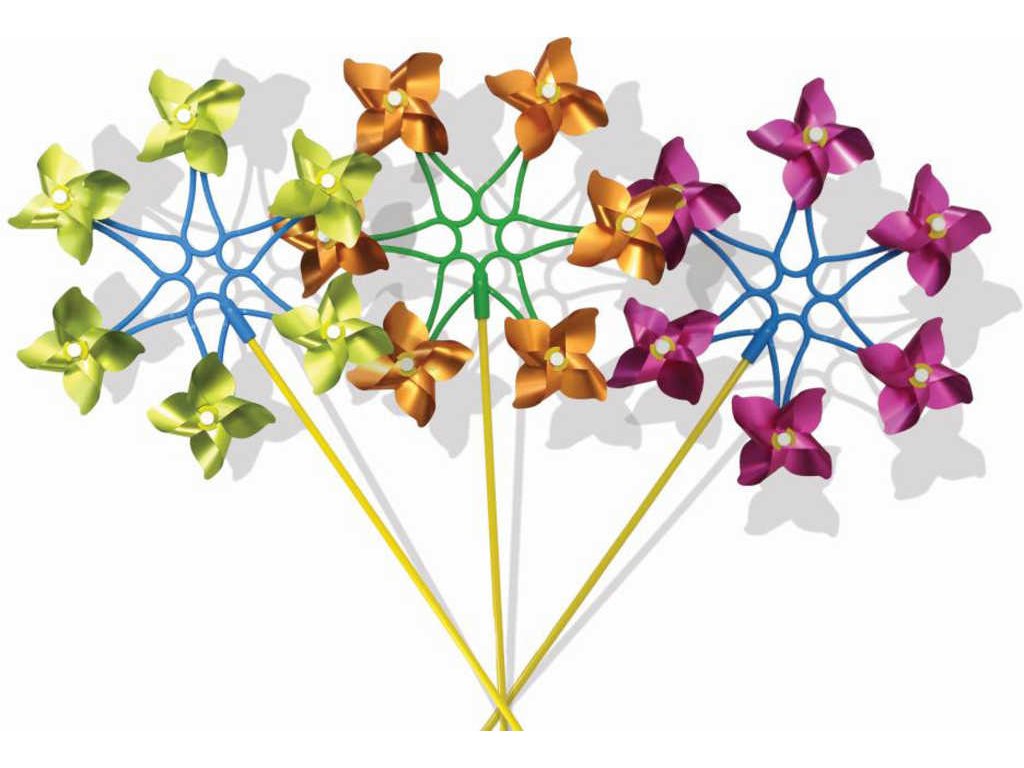 Velký barevný větrník s šesti samostatnými, jednobarevnými vrtulkami s kovovým leskem, pro šestinásobnou dětskou radost. Vykouzlí úsměv na každé dětské tváři. Vhodný pro hru na doma i jako dekorace na zahradu. Vylepšená kvalitní konstrukce pro dlouhodobou funkčnost. Baleno volně, ve čtyřech barevných variantách.