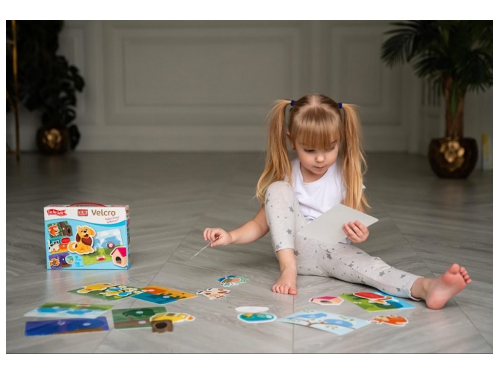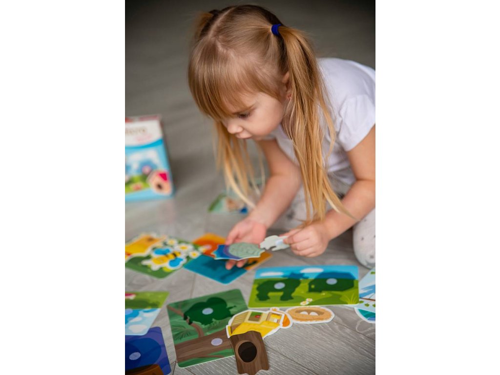 Děti trénují koordinaci ruka-oko, jemnou motoriku a dozví se více o zvířatech. Pak si spolu s dětmi si o životě zvířátek vyprávějte. Úkolem děti je najít zvířátku jejich správný "domeček", kde žije. Co je uvnitř?Sada obsahuje 8 pružných plastových destiček se suchým zipem a 16 samostatných dílků, které umístíte na destičky pomocí suchého zipu. Díky této vychytávce jednotlivé díly jen tak nespadnou a budou držet na správném místě. Všechny části jsou vyrobené z odolného, ale tenkého plastu se speciální povrchovou úpravou, která je dětem příjemná na dotek. Jak hrát? Berte jednotlivé dílky jeden po druhém a povídejte dětem co na nich je.Potom vezměte destičku s obrysy předmětů a vybídněte dítě, aby našlo správný předmět pro každý obrys a připevnilo ho pomocí suchého zipu na správné místo. Hlavní vlastnosti: zlepšuje motorické schopnosti trénuje vyjadřování a mluvenou řeč rozvíjí myšlení a paměť upevňuje udržení pozornosti