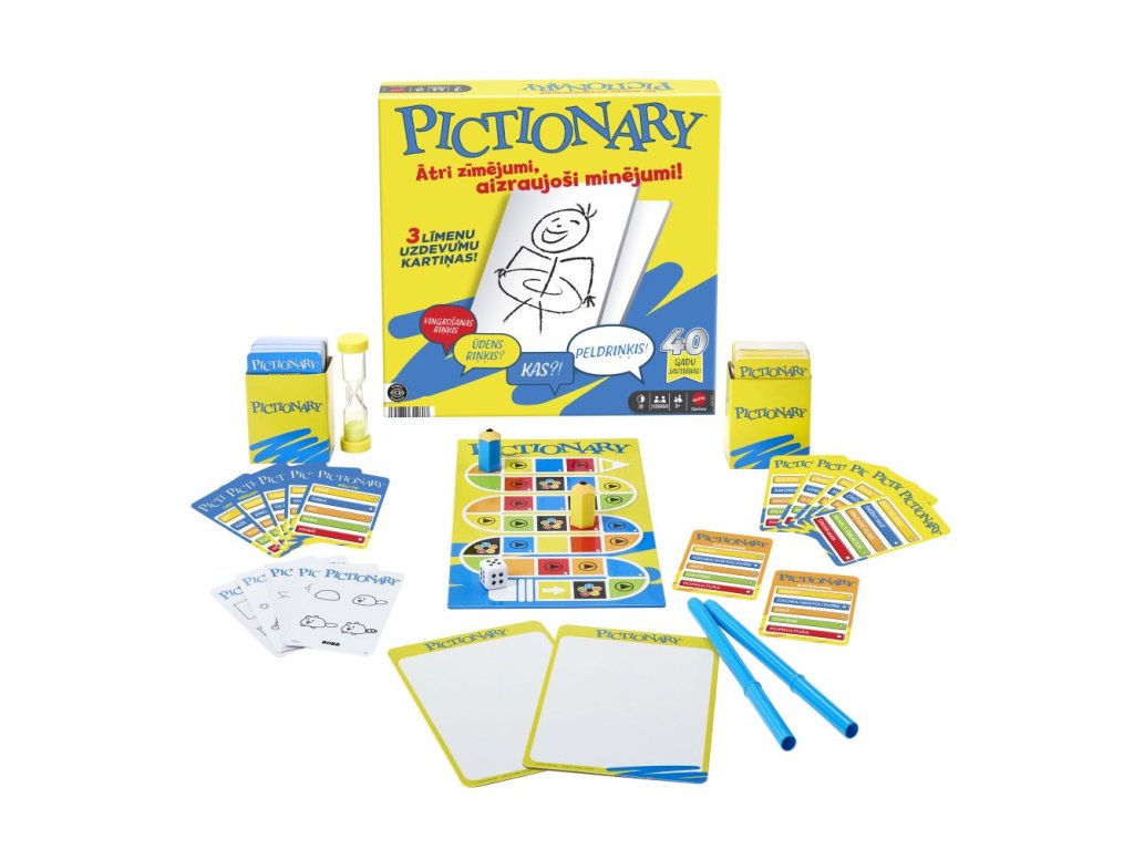Pictionary je klasická rodinná desková hra plná rychlých náčrtů a vtipných hádanek! V této neuvěřitelně zábavné hře pro proměnlivé hráče se týmy střídají, když jeden hráč kreslí a zbytek týmu hádá. Vyberte si ze 3 úrovní nápověd, takže se mohou zapojit i mladší hráči. Není nutné být umělcem a hádání může být ještě vtipnější než samotné náčrty! Barvy a vzhled výrobku se mohou lišit.