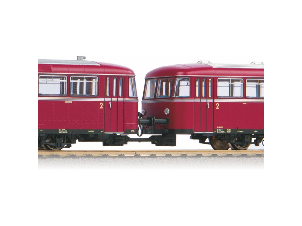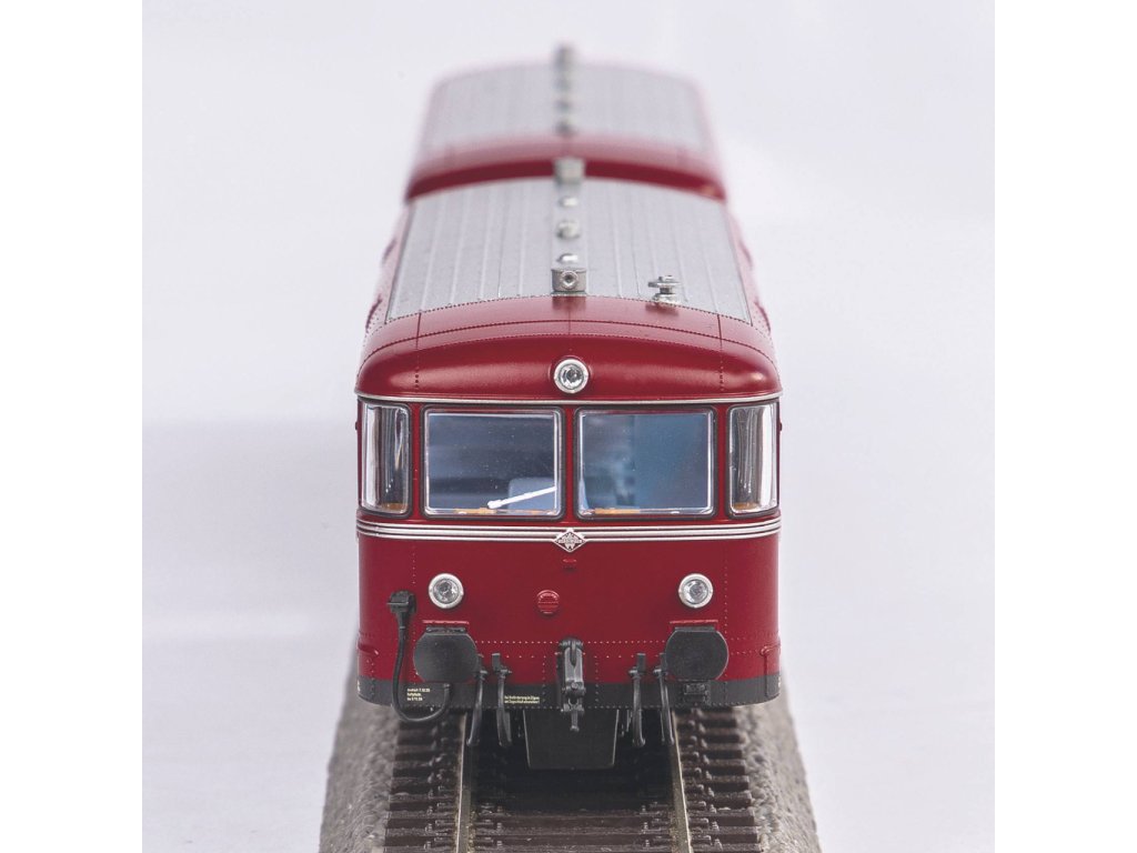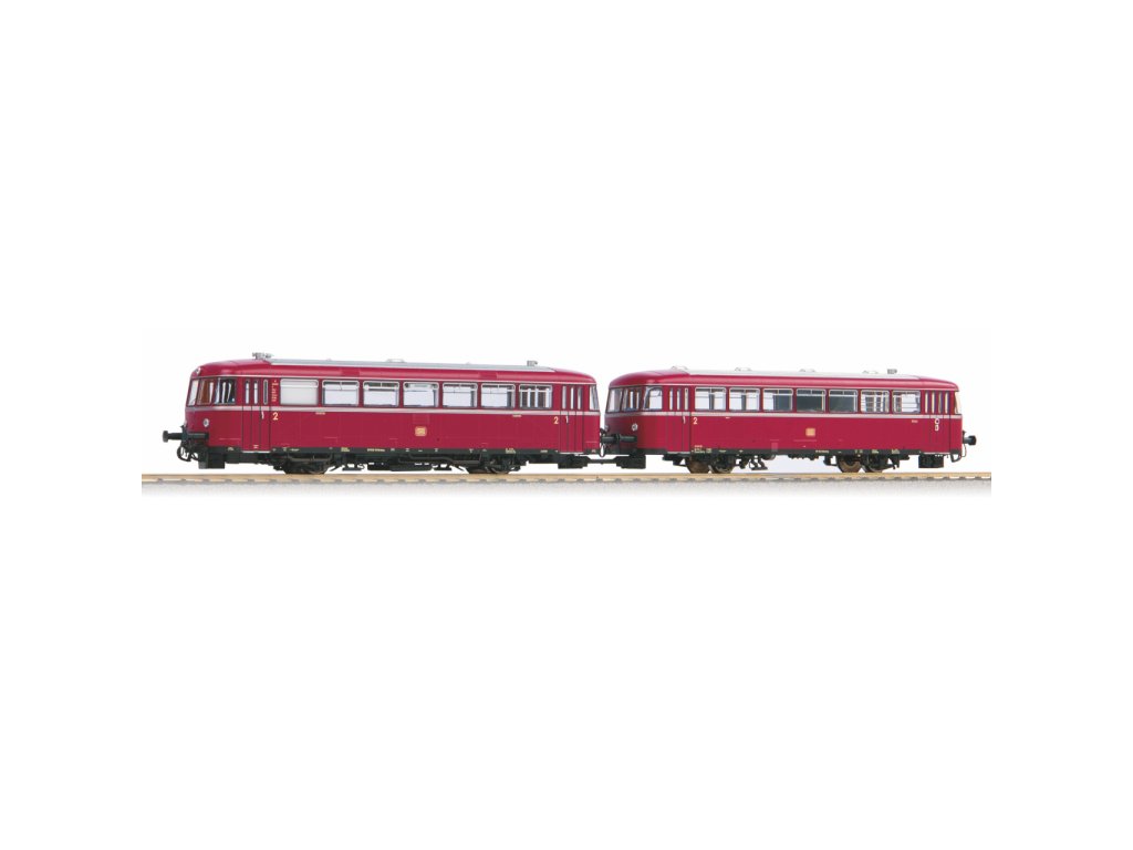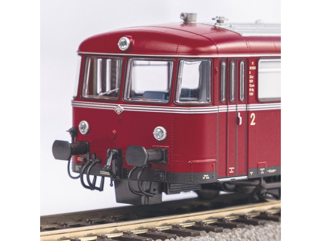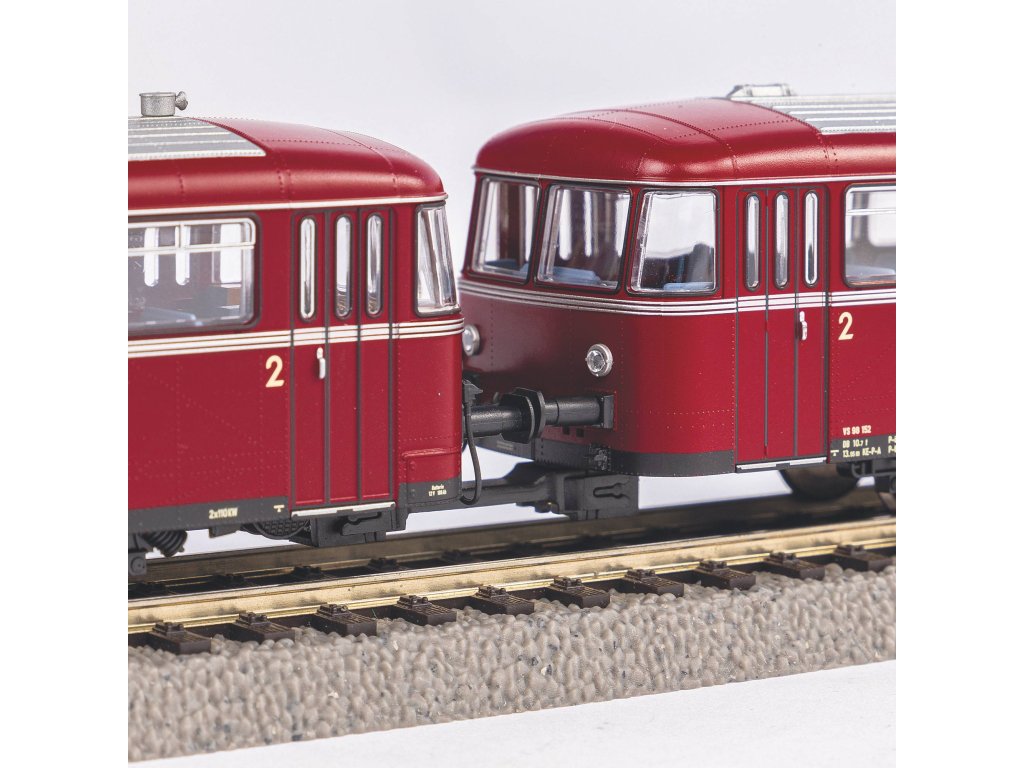 Souprava legendárního kolejového autobusu „Uerdinger“ zahrnuje motorový vůz VT 98 a řídící vůz VS 98. Předloha modelu proslula svými elegantními oblými tvary a hospodárností, kterou významným dílem přispěla k zachování lokálních tratí německých železnic. Model věrně reprodukuje původní stroje do nejmenších podrobností, je tak možno obdivovat pečlivě zpracované dveře, detaily členitého podvozku, táhlového ústrojí i náležitě ztvárněného nýtování na výlisku karoserie. Mimořádná pozornost byla věnována i provedení interiérů, do kterých lze nahlížet prostornými okny.Pohon zajišťuje výkonný mikromotor opatřený setrvačníkem, který spolu s vyrovnávacím kondenzátorem zajišťuje dokonale plynulý provoz. Vozy jsou těsně spojeny vodivým spřáhlem pro vždy hladký průjezd i bezproudými úseky trati. Samozřejmostí jsou plně funkční směrová světla, která mění barvu v závislosti na směru jízdy. Zvláštní péče byla věnována osvětlení interiéru, prostřednictvím digitálního ovládání je tak možno zvlášť ovládat světla v prostorech řidiče a cestujících. Atraktivně nasvíceny jsou rovněž cedule s vyobrazením názvu cílové stanice, umístěné na bocích pod střechou motorového vozu.Souprava je vybavena digitálním dekodérem se zvukovým modulem a reproduktorem, který obsahuje knihovnu zvuků věrných předloze a umožňuje individuálně ovládat světla v obou vozech. Je kompatibilní s protokoly DCC, Rail-Com® a Motorola®, a umožňuje i provoz v analogovém režimu. Příslušný provozní režim umí sám chytře rozeznat. S ovládacími jednotkami PIKO SmartControl, nebo i jednotkami kompatibilními s formátem mfx®, nabízí široké možnosti individuálního mapování. Hlavní vlastnosti: digitální ovládánínapájení DCvestavěn digitální dekodér se zvukovým modulem a reproduktoremdvojice nápravmotor se setrvačníkemdvojice bandážovaných hnacích kolsvětla s přepínáním barvy dle směru jízdypřepínatelné osvětlení interiérurozhraní PluX22 dle NEM 658šachta dle NEM 362 s kinematikou krátkého spřáhla Tato sada obsahuje: motorový vůz VT 98 „Uerdinger“ DB III (1 ks)řídící vůz VS 98 „Uerdinger“ DB III (1 ks) Dokumentace: obecné informace k soupravám VT 98/VS 98 „Uerdinger“ (DE, EN, FR, NL)návod k obsluze a seznam náhradních dílů modelu č. 52735 (DE, EN, FR, NL)