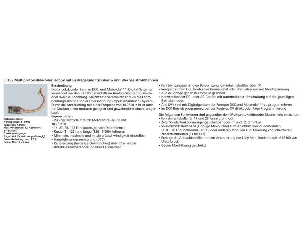 Malý, výkonný multiprotocol dekodér. Může být použit se systémy DCC a Motorola®. Pracuje také v analogovém režimu se stejnosměrným napětím. Zpracovává i přepínání směru jízdy pomocí přepěťových impulzů (systém Märklin). Dekodér pracuje s frekvencí 18,75 kHz a je tak vhodný i pro plynulý provoz s motory využívajícími oběžný rotor (Glockenanker). Hlavní vlastnosti: rozhraní NEM 652 (8pin) Dokumentace: Manuál (EN)Tabulka konfigurací (EN)