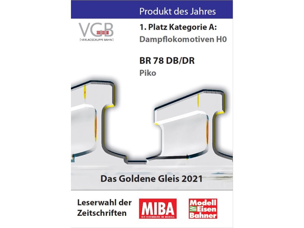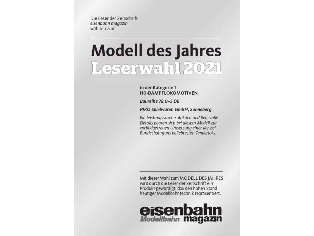 Přichází moderní nástupce velmi oblíbené a dříve hojně rozšířené lokomotivy řady BR 78 v podobě zcela nové konstrukce z dílny PIKO a zároveň první parní lokomotiva v produktové řadě Expert. Tento model nastavuje laťku kvality v řadě Expert ještě výše. Téměř všechna potrubí jsou vedena samostatně, kabina strojvedoucího, vodní nádrže a dýmnice jsou detailně zpracovány s jemnými imitacemi nýtových hlav. Paprsky kol a parní rozvod jsou vyrobeny z vysoce kvalitních materiálů a působí mimořádně jemně. Skvělé jízdní vlastnosti zajišťuje 5pólový motor PIKO se setrvačníkem. Přídavná závaží v kotli a dva bandážované nápravové prstence se starají o vysokou tažnou sílu. Díky modernímu rozhraní PluX22 je dodatečná instalace dekodéru velmi snadná. Stejně jednoduše lze doplnit reproduktor a kouřový generátor. O autentickou provozní atmosféru se stará LED osvětlení závislé na směru jízdy. Specifikace: napájení DCanalogové ovládání délka s nárazníky 170 mmšachta NEM minimální rádius 422 mm2 trakční pneumatikydigitální rozhraní NEM 658 PluX22zvuk – ne, dodatečná montáž zvukového dekodéru PIKO - číslo položky 56584 venkovní osvětlení - bílá/červená svítí v závislosti na směru jízdydodatečná montáž funkce páry – číslo položky 56163 digitálně přepínatelné osvětlení kabiny a osvětlení topeniště (s dekodérem PluX22) Hlavní vlastnosti: realistické barevné provedenídetailní zpracováníatraktivní design