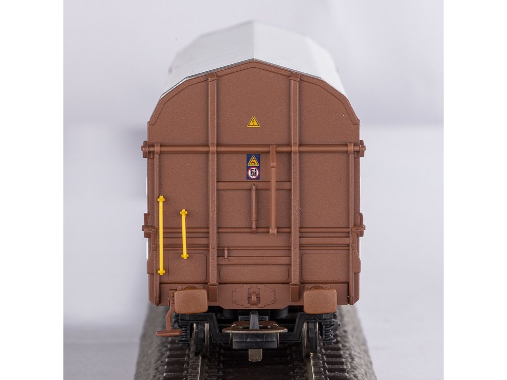 Dvojice čtyřnápravových vozů s plachtovým krytem Shimmns Železniční společnosti Slovensko, určených k přepravě svitků plechu. Nabízí propracované výlisky podvozku i čelních stěn s detaily mechanismu jištění plachty. Krytí lze sejmout, a odhalit tak členitý vnitřní prostor s lůžky pro náklad (součástí balení je jeden svitek). Vůz zdobí atraktivní, barevně kontrastní detaily v podobě madel a kotviček. Vysoce kvalitní lakování a ostrý potisk zachycují i nejmenší podrobnosti předlohy. Samozřejmostí jsou precizně uložená dvojkolí zajišťující prvotřídní jízdní vlastnosti. Hlavní vlastnosti:čtveřice nápravsnímatelné krytí, součástí je vzorek nákladušachta dle NEM 362 s kinematikou krátkého spřáhla Dokumentace:návod k obsluze a seznam náhradních dílů modelu č. 58258 (DE, EN, FR, IT)