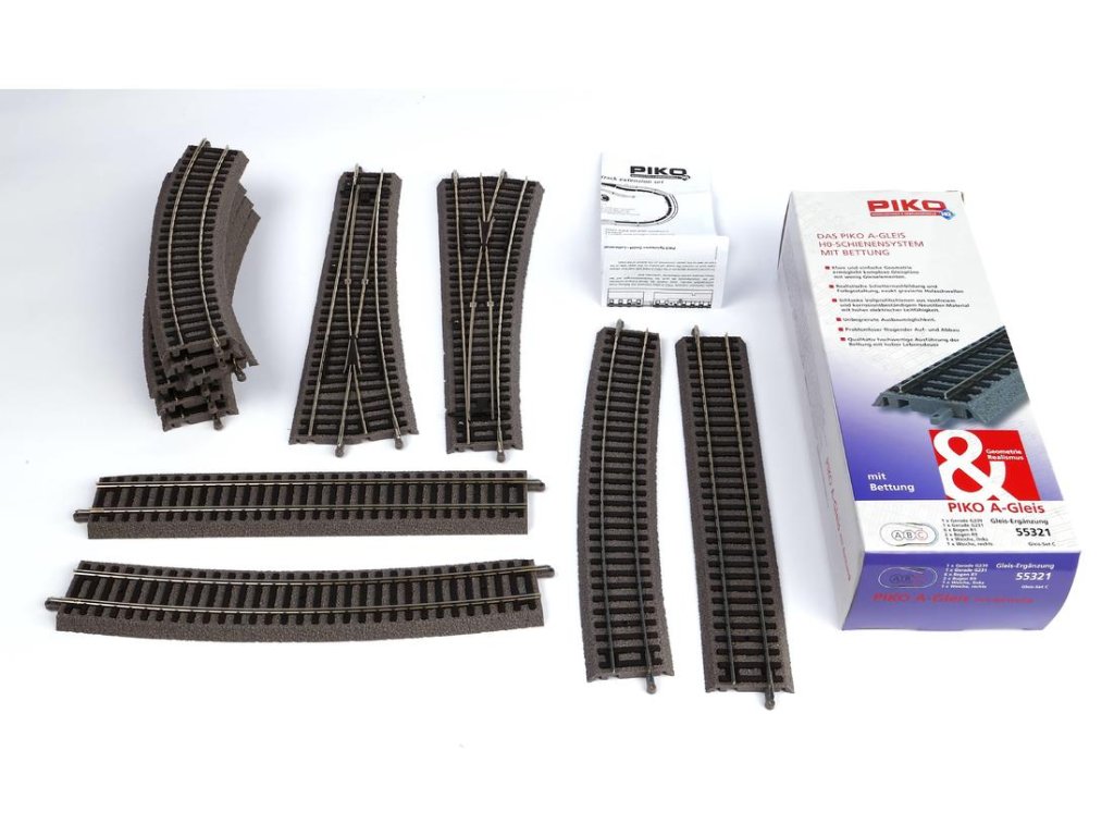 Sada kolejí s detailní reprodukcí dřevěných pražců na štěrkovém podloží, ve věrných barvách. Zahrnuje paralelní oblouk s rovným úsekem a dvěma jednoduchými výhybkami. Ke kompletaci samostatně napájeného oválu s kusou kolejí (viz ilustrační obrázek) nutno doplnit o sadu B, obloukové koleje R2 v příslušném množství a dvojici rovných kolejí, jedné s přípojem pro napájecí svorku. Výhybky lze ručně ovládat. Nabízí se také dálkově ovládané přestavníky, pro které jsou zde uchystaná připojení a je vhodné je doplnit příslušným podložím. Plocha základny: 158x88 cmMinimální konstrukční plocha: 168x98 cm Hlavní vlastnosti: paralelní oblouk s rovným úsekem a dvěma výhybkamivčetně podloží Tato sada obsahuje: kolej rovná G239 s podložím - 55400 (1 ks)kolej rovná G231 s podložím - 55401 (1 ks)kolej oblouková R1 s podložím - 55411 (6 ks)kolej oblouková R9 s podložím - 55419 (2 ks)výhybka WL jednoduchá (G239/R9) levá s podložím - 55420 (1 ks)výhybka WR jednoduchá (G239/R9) pravá s podložím - 55421 (1 ks) Dokumentace: Návod k obsluze (DE, EN)Brožura ke kolejivu PIKO H0 A-Gleis (DE, EN)