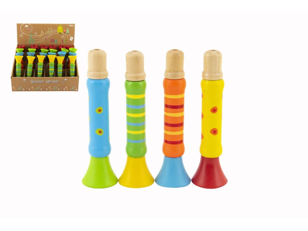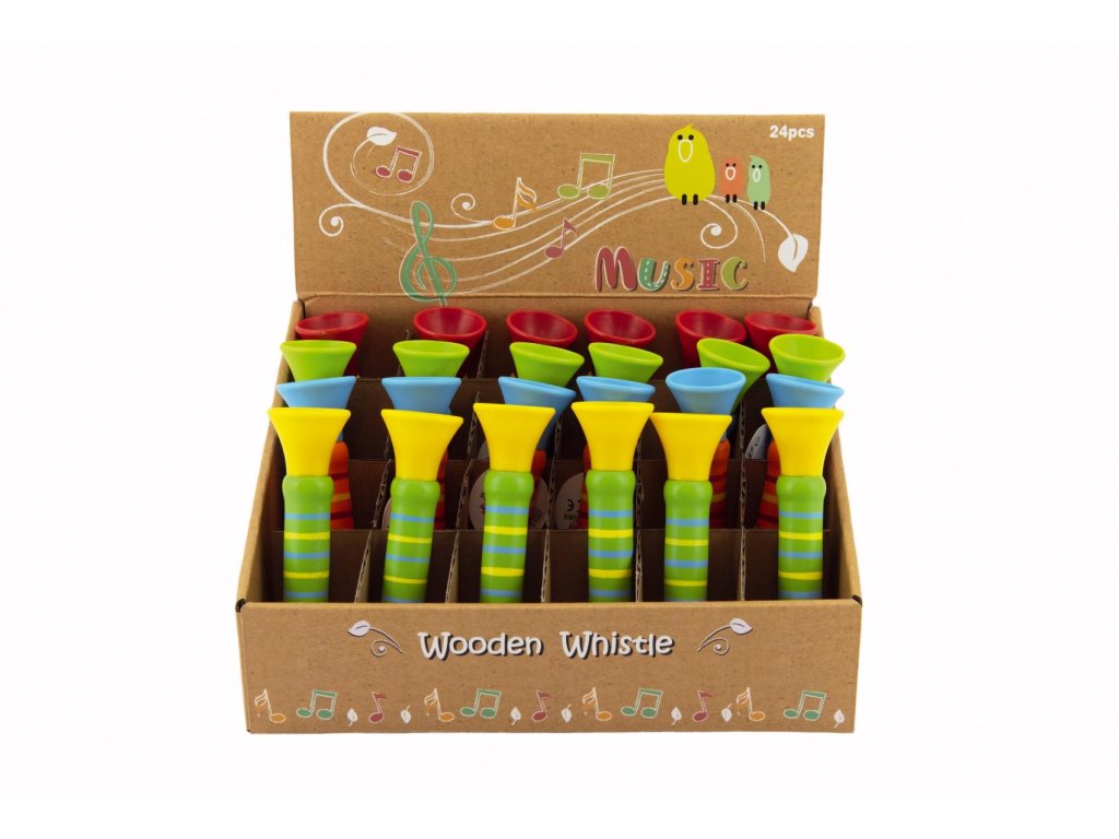 Píšťalka dřevěná barevná 12 cm 4 barvy 24ks v boxu 18m+