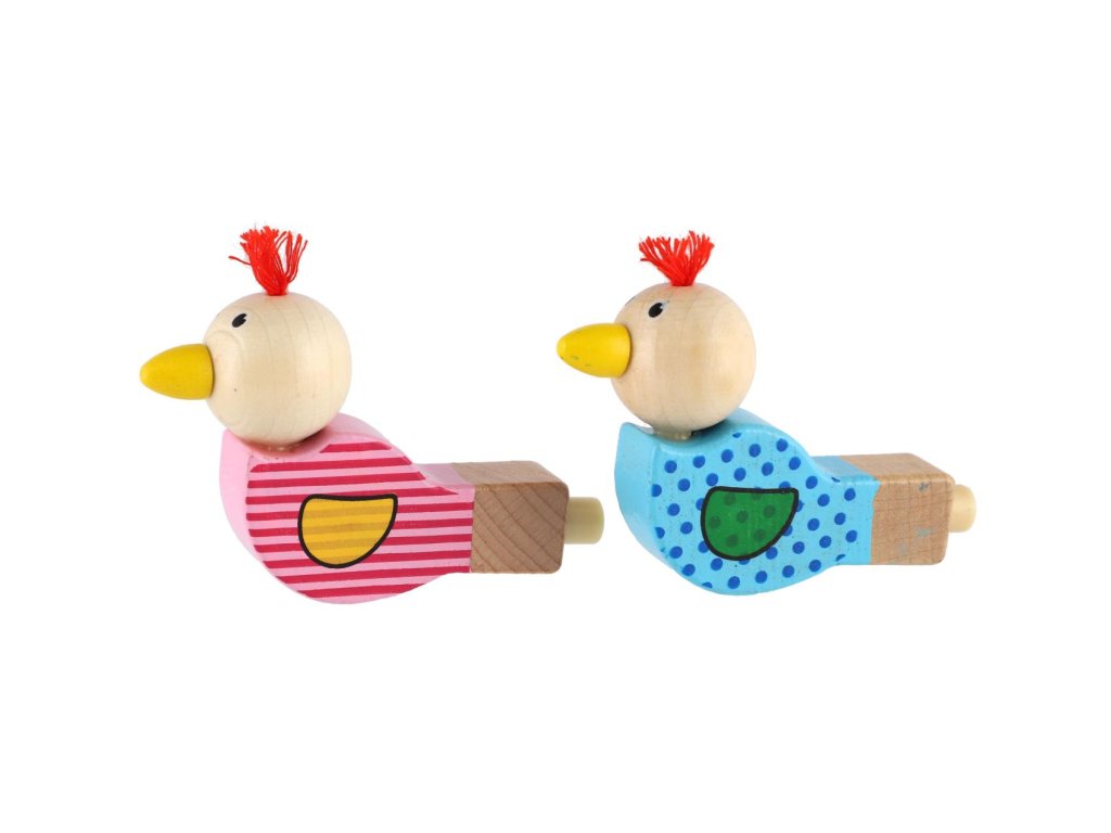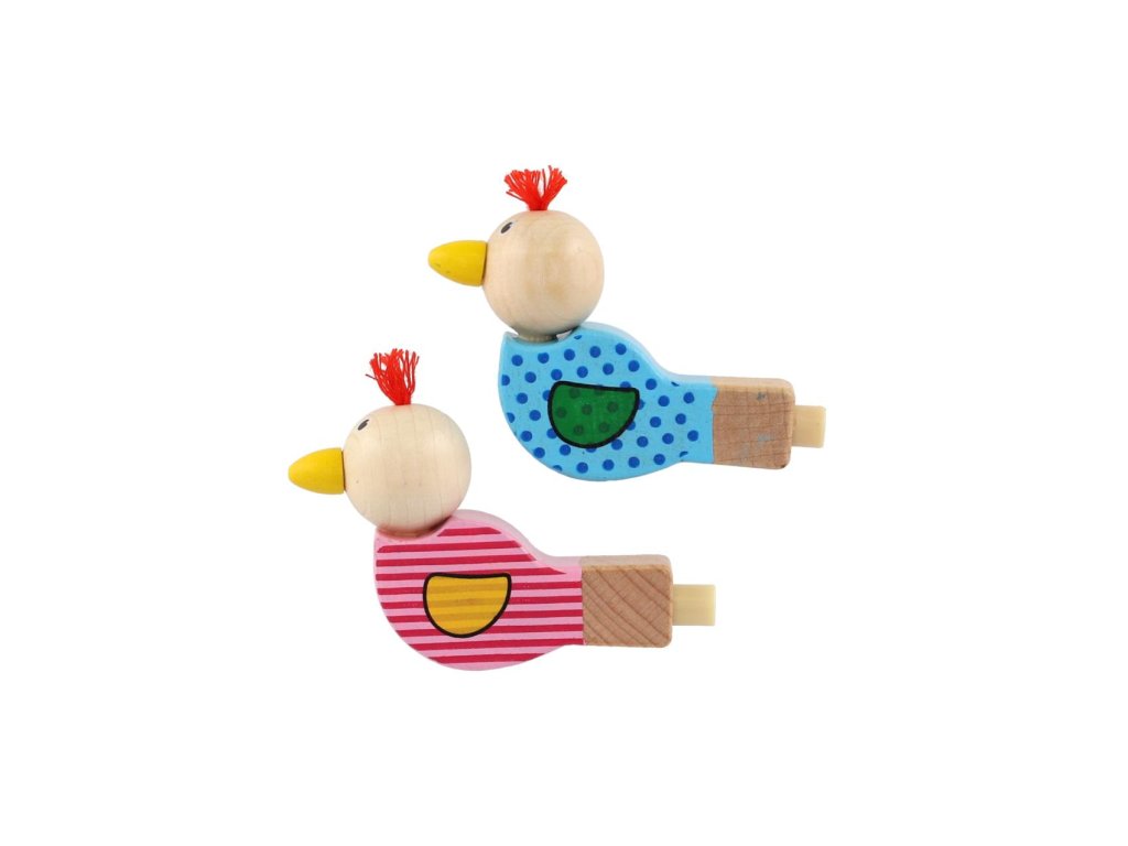 Roztomilá dřevěná píšťalka ve tvaru barevného ptáčka vykouzlí úsměv na tváři každému dítěti. Po fouknutí vydává příjemný zvuk a díky svému tvaru se perfektně drží i menším dětem. Je vyrobena z kvalitního dřeva, zdobená veselými motivy a doplněná malým střapcem jako „čupřinou“.