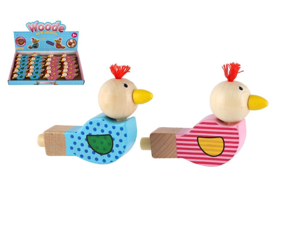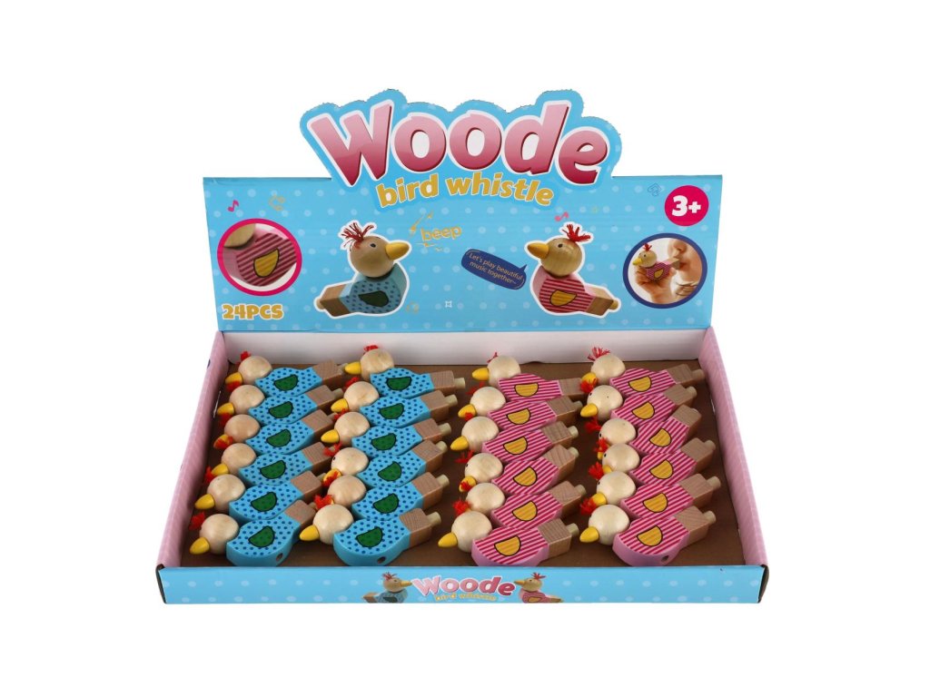 Píšťalka ptáček dřevo 8cm 2 barvy v sáčku 24ks v boxu