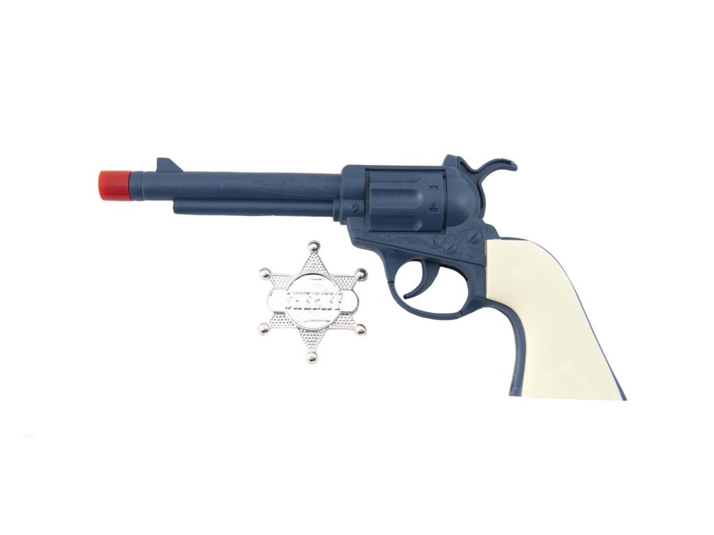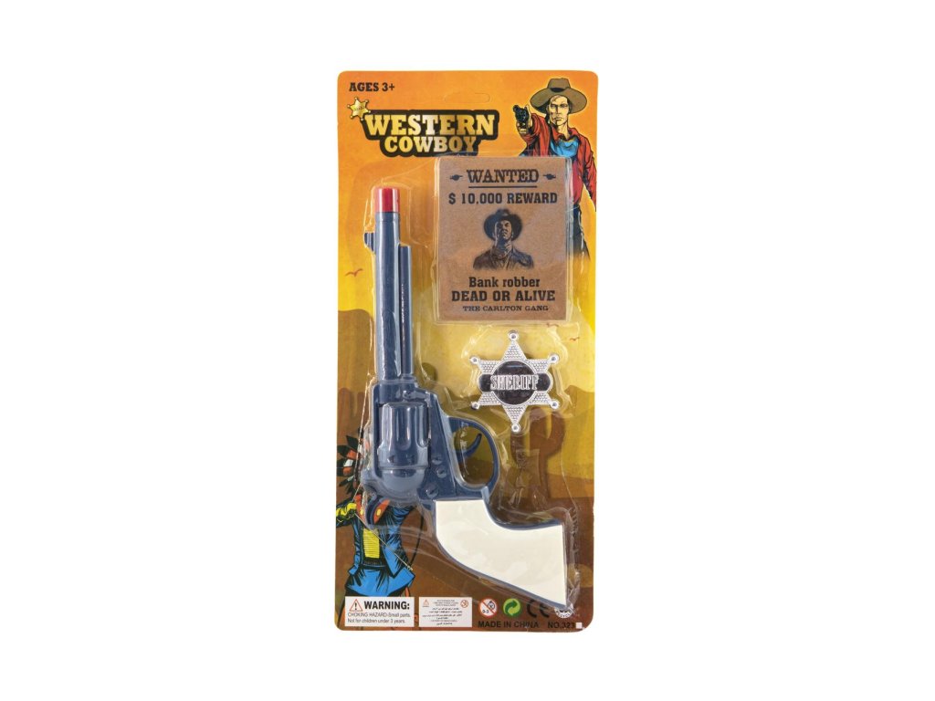 Život kovboje je snem spousty chlapců. S touto sadou a pistolí se svému snu lehce přiblíží. Pistole pro všechny malé pistolníky a kovboje. Puška vydává klapací zvuk. Sada obsahuje také odznak a plakátek hledaného zločince.