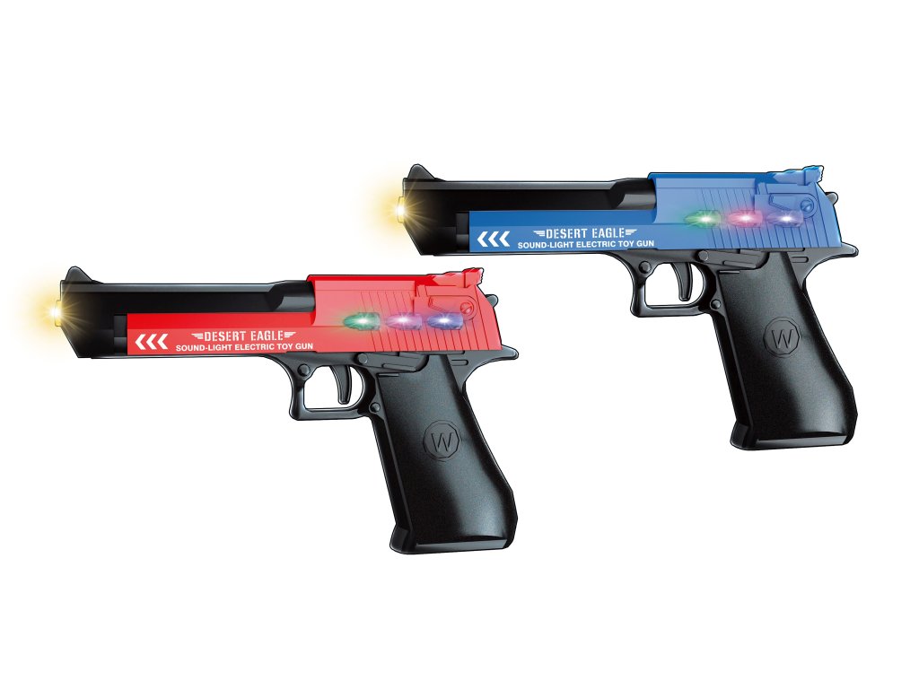 Pistole s efekty. Rozměry 22x14x3,6 cm. Světelné a zvukové efekty. 3xAA baterie nejsou součástí. 2 varianty - modrá, červená.