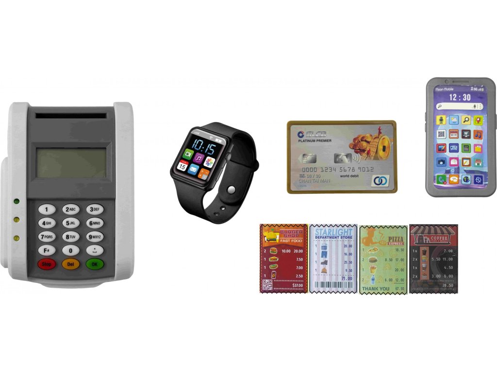 Plať kartičkou: Jasně, že k němu patří kartičky, jako ty, co mají mamka s taťkou! Jen je zasuneš nebo přiložíš a zaplaceno.