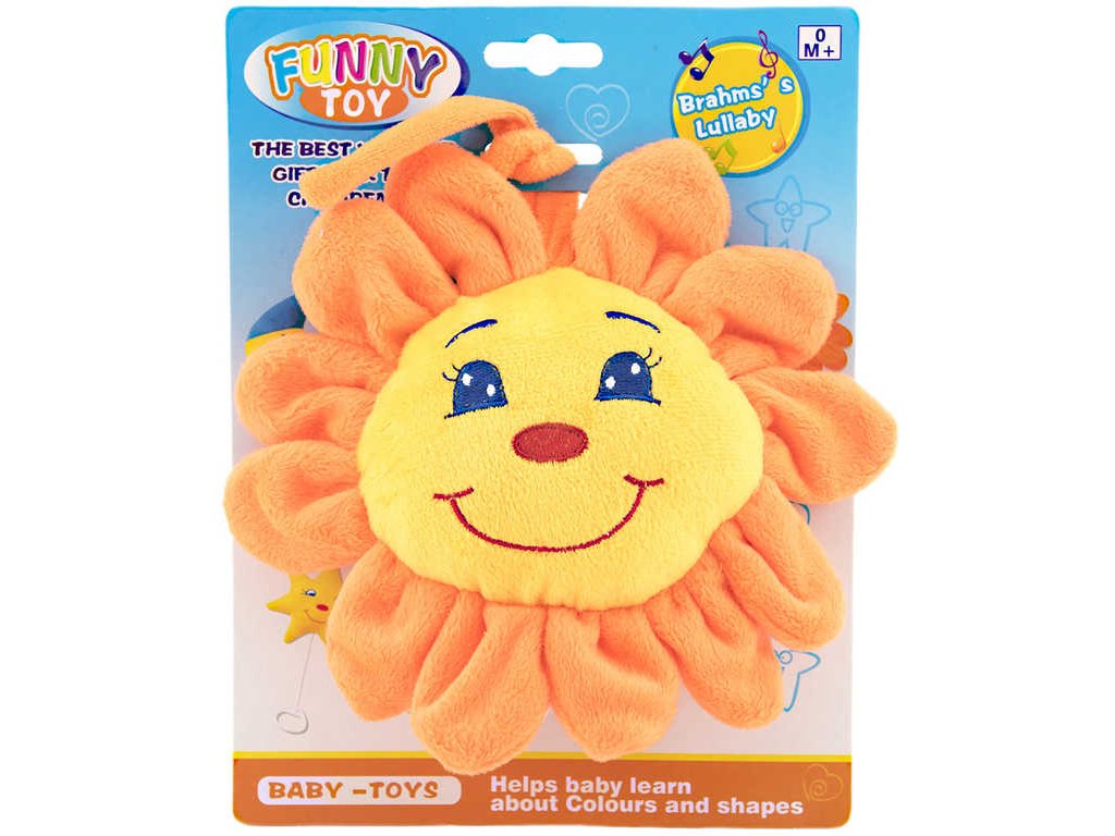 Krásná hrající dětská natahovací plyšová hračka v podobě žluto-oranžového usměvavého sluníčka, v zářivých barvách, z plyše na usínání, vhodná pro nejmenší děti, pro miminko. K zavěšení nad dětskou postýlku nebo na