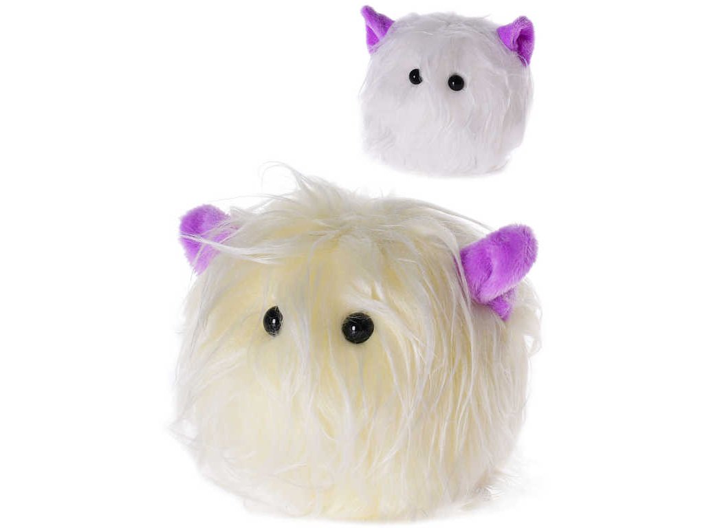 Vlasatá plyšová koule se dvěma očima a fialovými oušky jako Skibbles voňavé zvířátko, ve dvou barevných variantách.