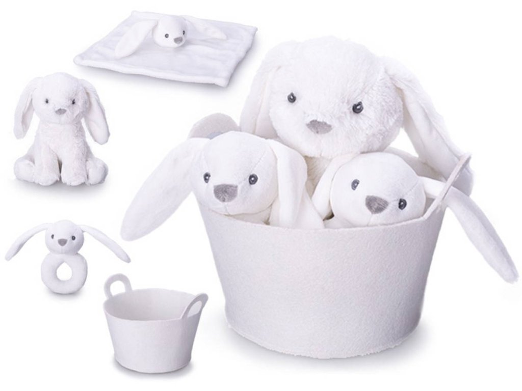 Obsah balení: košík, plyšák zajíc, chrastítko, mazlící dečka