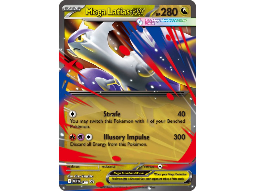 Pokémon Mega Latias ex Box je speciální produkt obsahující dvě promo karty a jednu sběratelskou Jumbo kartu - Mega Latias ex. V boxu se dále nachází 4 doplňkové balíčky novějších edic a samozřejmě kód do online hry. Jumbo karta Latias je holografická karta, která vytváří při pohledu na ni prostorový dojem. Mega Latias je tak skutečně Mega. Jedná se o relativně unikátní jumbo kartu, která je speciální oproti běžným jumbo kartám. Mega Evolution posouvá sílu legendárního Pokémona Latiase na jeho hranici! S úžasnou rychlostí se řítí oblohou s dračí silou. Nyní se můžete spojit s Mega Latiasem ex jako hratelnou foilovou promo kartou a navíc s Jumbo lentikulární kartou s úžasným grafickým zpracováním. Získáte také čtyři boostery s ještě větším počtem Pokémonů uvnitř!