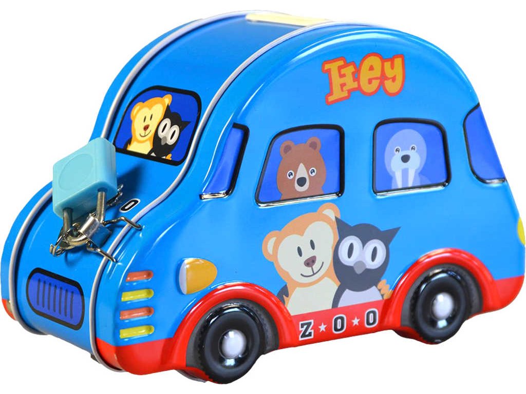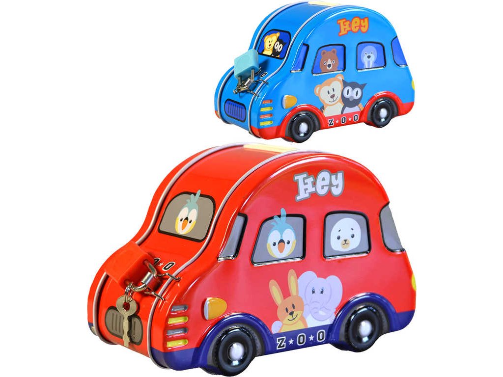 Originální plechová reliéfní pokladnička ve tvaru autíčka, ve třech barevných variantách, s uzamykáním na zámek, pro všechny malé šetřílky.