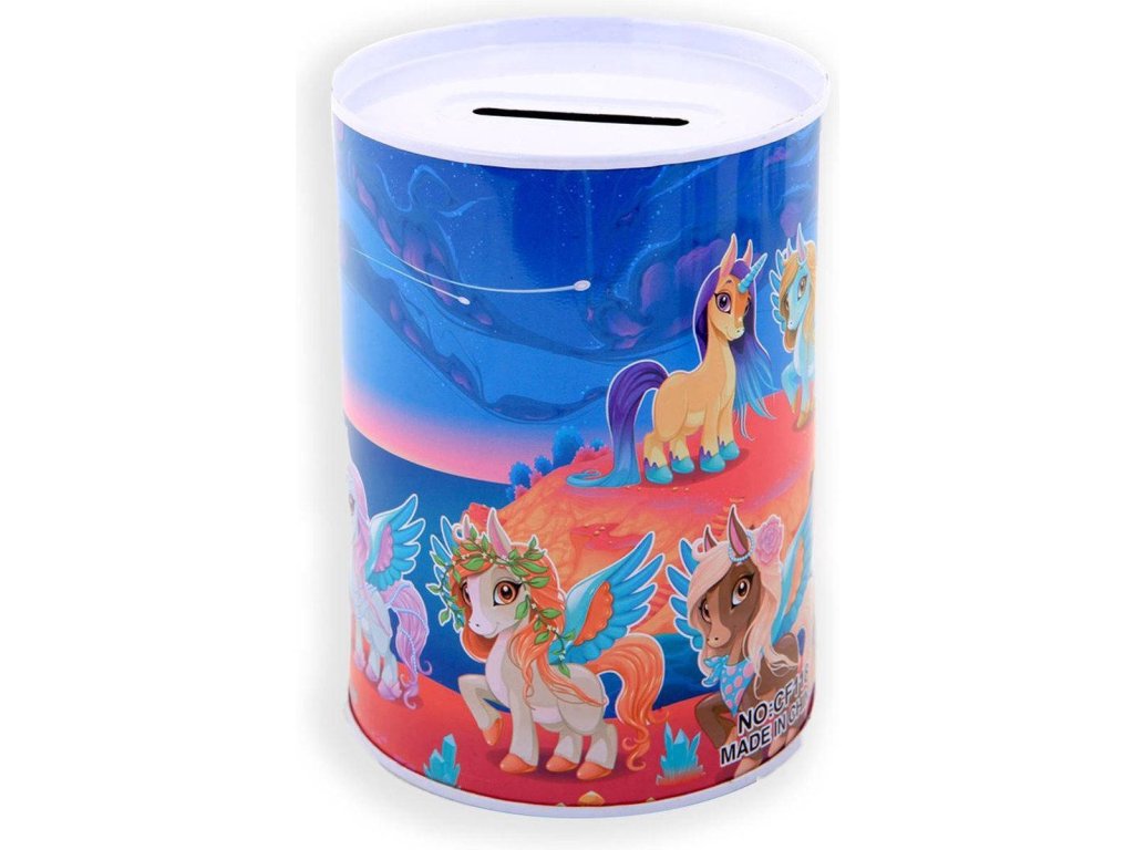 Pokladnička válec jednorožec 12cm dětská kasička plechová 5 druhů