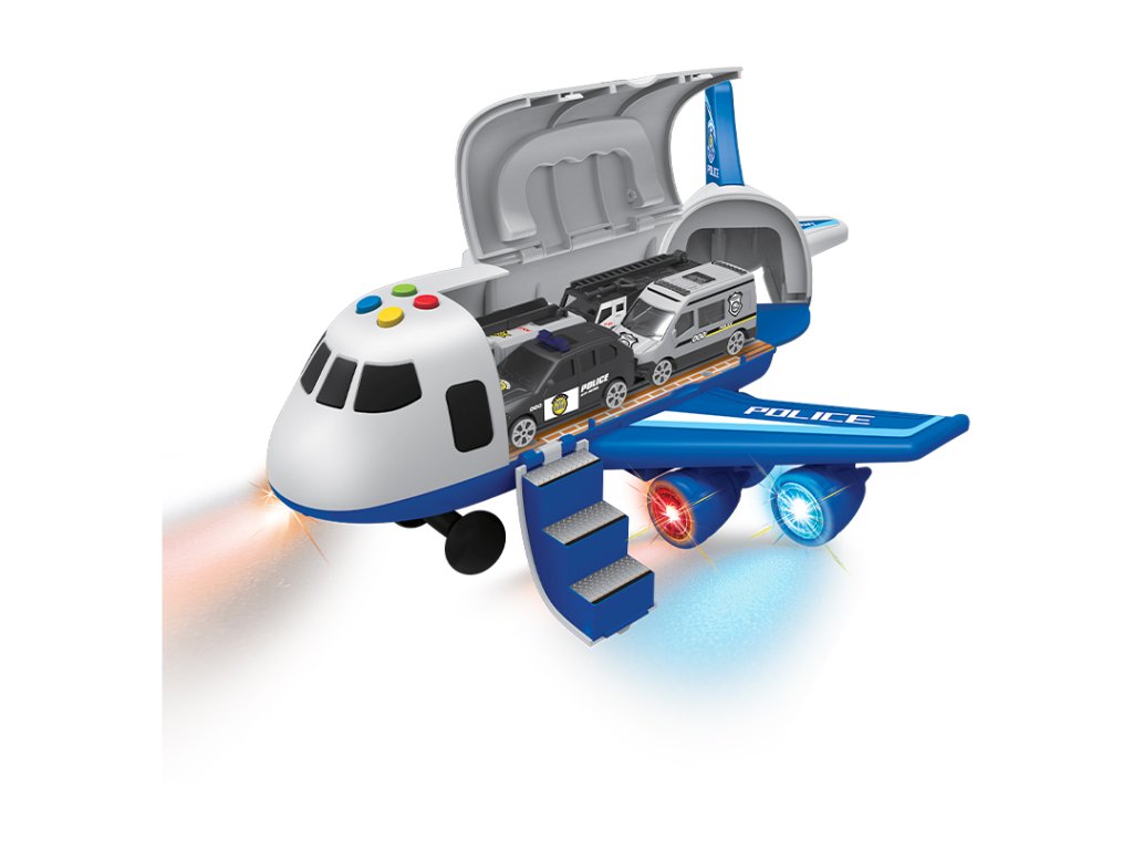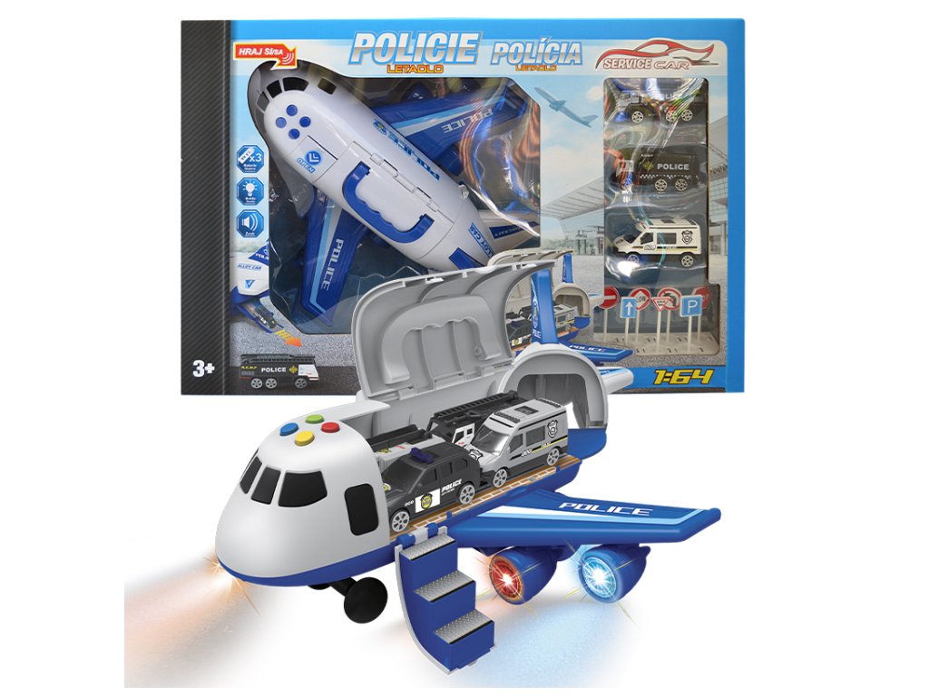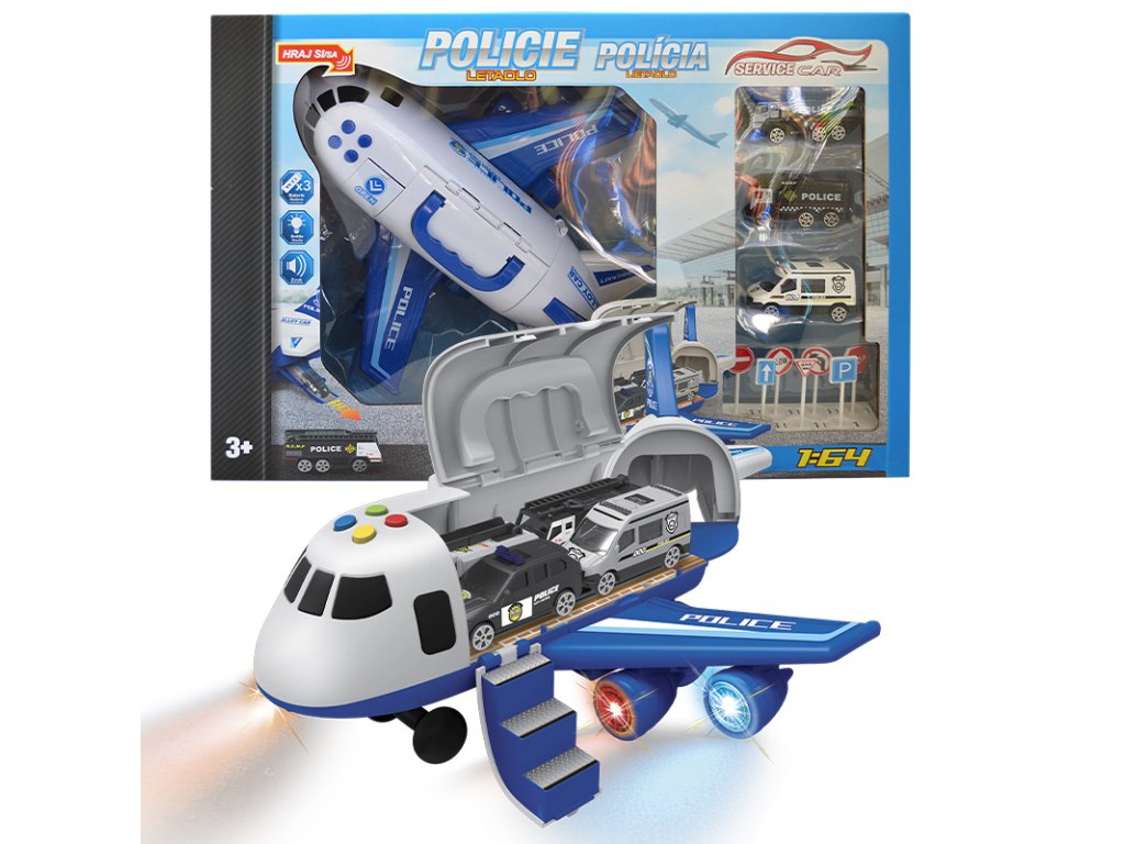 - GARÁŽ/LETADLO POLICIE – s příslušenstvím (sada) - Rozměr garáže po rozložení: 25x28x30cm, tlačítka pro zvukové a světelné efekty, jízda na setrvačník - Obsah sady: hasičské letadlo/garáž 2v1 (funkce přeměny z letadla na garáž a zpět) a kovový model autíčka 1:64 (3 ks) Výrobek na baterie :Použijte 3x baterie "AA" 1,5V (nejsou součástí balení). 3+