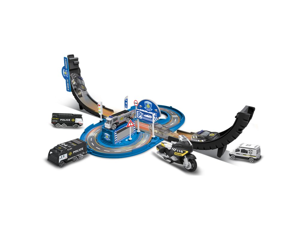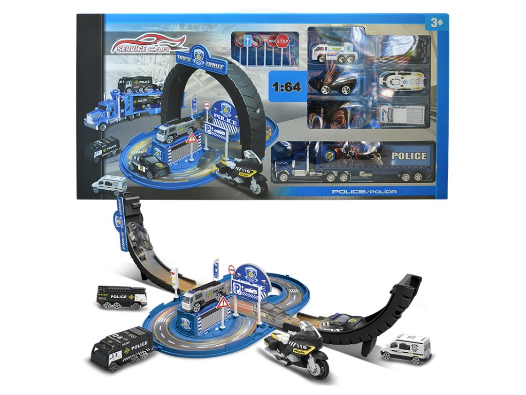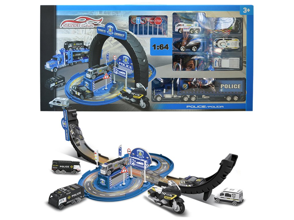 - GARÁŽ/OKRUH POLICIE – s příslušenstvím (sada) - Obsah sady: policejní dopravní okruh/garáž 2v1 (funkce přeměny z garáže na okruh a zpět), kovový model autíčka 1:64 (6 ks) a kamion - Nevhodné pro děti do 3 let.