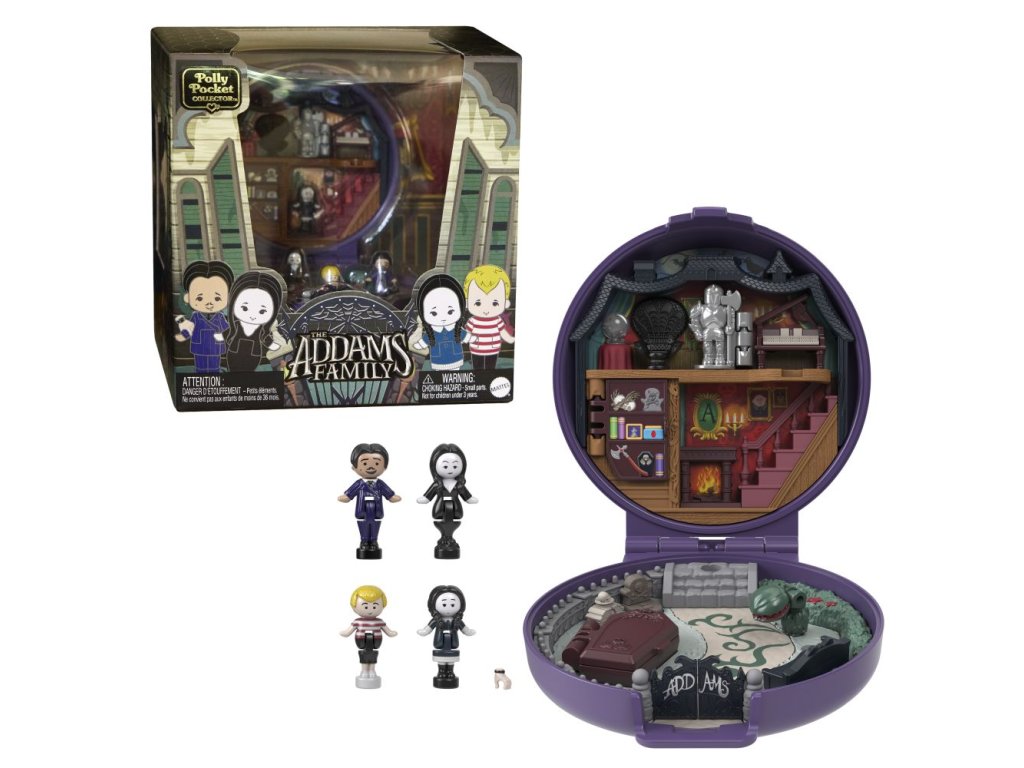 Není to jen tak něco obyčejného... je tu Polly Pocket™ x Addamsova rodina v pidi verzi! Strašidelný lentikulární portrét na vnější straně se otevírá do ikonického domu a dvora Addamsovy rodiny. Fanoušci mohou přehrávat strašidelné scény se 4 hlavními postavičkami v pidi verzi, včetně figurek a ruky, kterou lze připojit k postavičkám. Balení obsahuje promyšlené doplňky a interaktivní prvky, jako např. masožravou rostlinu, tajnou pokladovou místnost za knihovnou, rytíře a rakev.