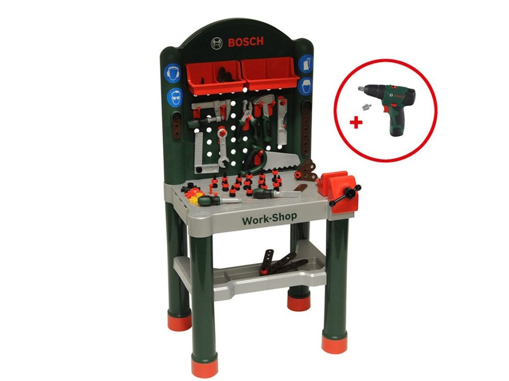 Pracovní stůl v originálním designu Bosh včetně 79 dílů je ideální pomocník pro malého kutila.