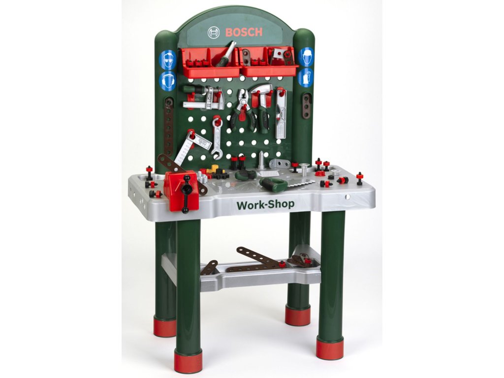 Pracovní stůl v licenci BOSCH nesmí chybět v dílně žádného kutila. Stůl obsahuje 82 doplňku včetně pracovní desky, svěráku, třech úložných boxů a jednoho velkého, různé šrouby, matice, prkna a mnoho dalšího.. . Pracovní stůl je vhodný pro děti od 3 let.