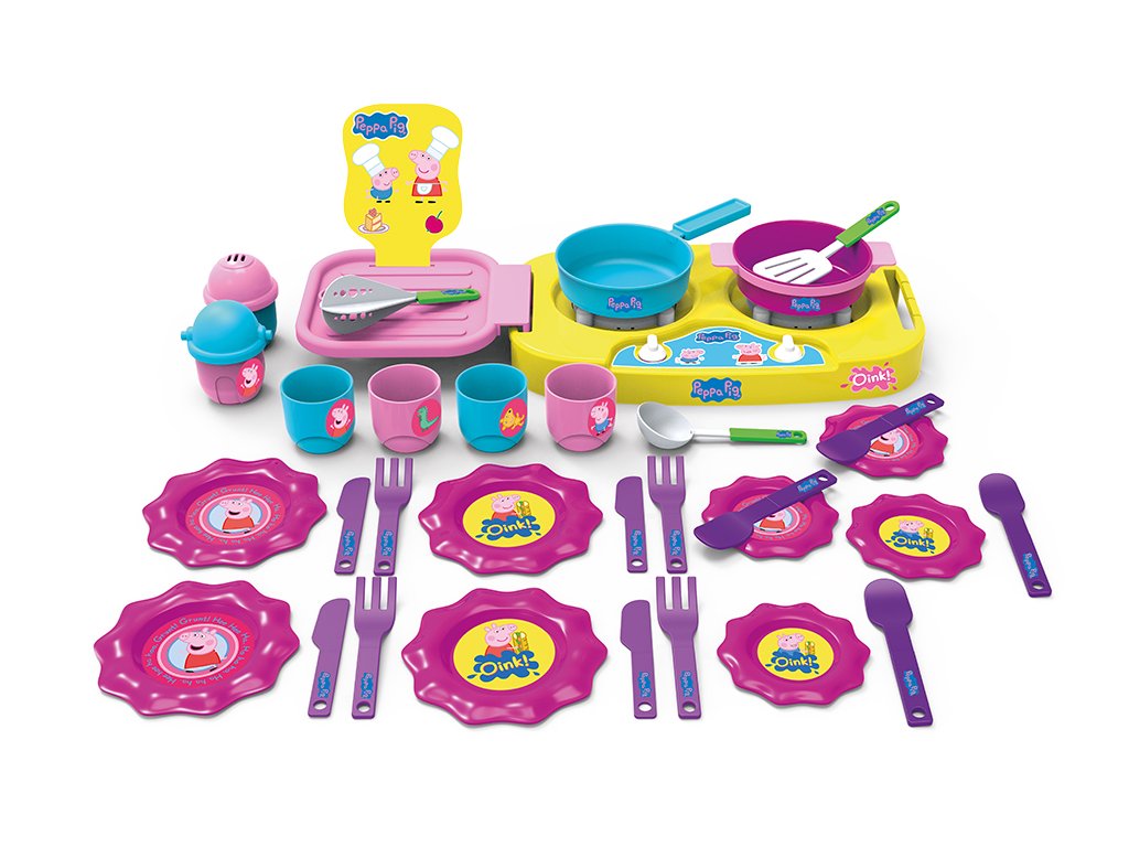 Plastová sada vařiče, hrnců, talířků vidliček a dalšího příslušenství s motivem prasátka Peppy, 35 dílů.