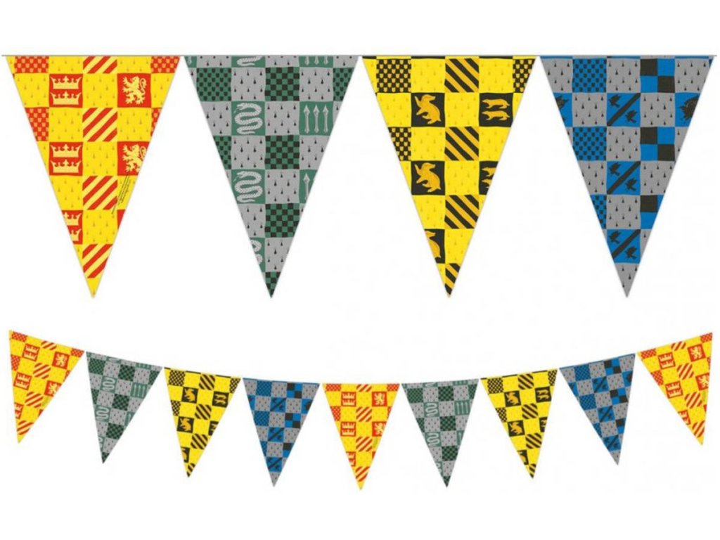 Vlaječkový banner měří 2,3m a skládá se z 9ks papírových vlaječek z tvrdého papíru a látkové stuhy. Vlaječková girlanda se bude hodit na každou dětskou oslavu! Široký banner vám umožní vyzdobit místnost, kde se párty koná! Téma Harryho Pottera potěší všechny malé hosty.