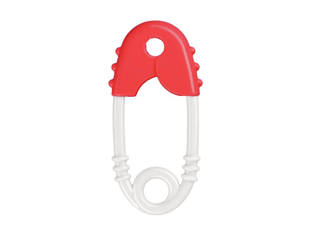 Vícebarevné plastové chrastítko ve tvaru kancelářské sponky, v několika barevných mixech, s hladkým nebo vroubkovaným tělem, pro nejmenší děti, pro miminko. Baleno v sáčku po 1ks.