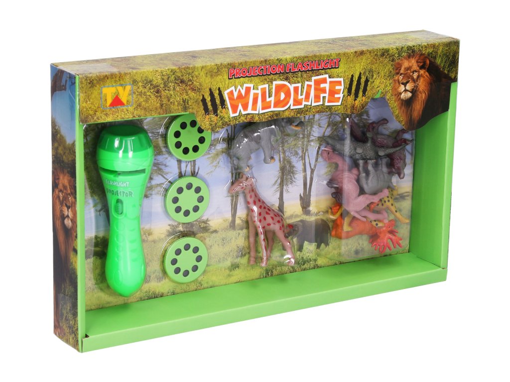 Projektor 24 snímků se zvířátky - Safari. Obsahuje projektor, 3 kotouče se snímky (celkem 24 snímků), 8 figurek safari zvířátek. Délka projektoru 11,5 cm, velikost zvířátek 5 - 7 cm. 3xAG13 baterie do projektoru součástí. Přepínač ON/OFF na projektoru. Zaostřovací prstenec na projektoru.