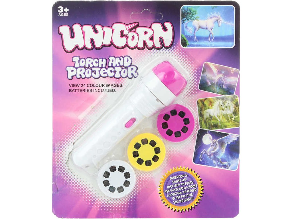 Plastový dětský mini projektor na baterie. Součástí jsou 3 kotoučky s obrázky (celkem 24 obrázků). Po stisknutí tlačítka projektor promítá obrázky pohádkových jednorožců na zeď (nebo jinou bílou plochu).