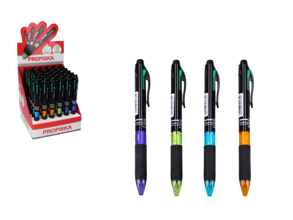 Barevná propiska s modrou náplní vhodné na psaní do školy i na doma.