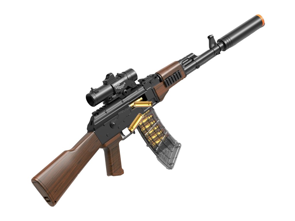 Puška AK-47 s patronami a pěnovými náboji. Velikost 91 cm. Puška rozložitelná na jednotlivé části. Součástí tlumič, hledí, 8 patron, 20 pěnových nábojů (10 standardních, 10 s přísavkou). Návod s obrázky a instrukcemi na sestavení a používání na zadní straně obalu.