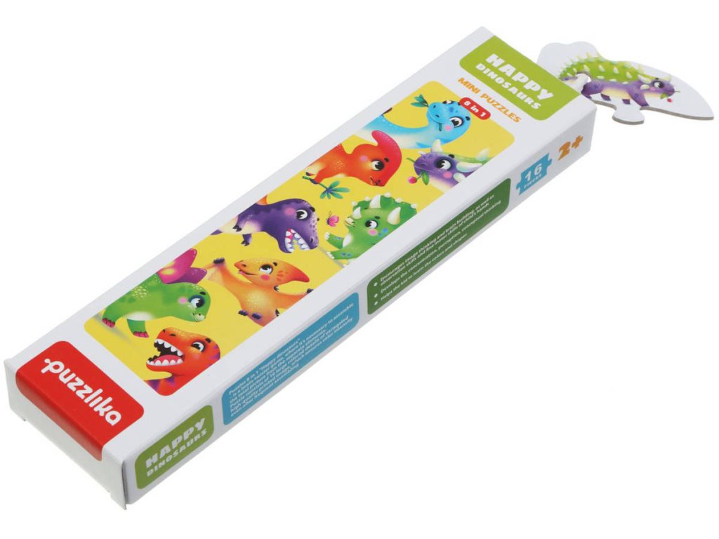 oko ruku, logické myšlení a navíc si užijí legraci. Puzzle Dinosauři obsahuje 16 velkých pevných puzzlů, ze kterých poskládáte 8 samostatných obrázků veselých dinosaurů.