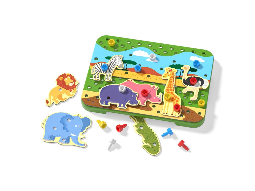Zažijte dobrodružství se zvířátky v divoké džungli či horké savaně! V této dětské stavebnici z perforovaných dílů a propojovacích šroubků můžete snadno sestavět scenérii jako z divočiny. Čekají na vás tři tematická pozadí s devíti exotickými zvířaty jako např. lev, hroch či hrozivý krokodýl. Skládání vlastních obrázků je velmi snadné a zvládnou je i malé ručičky. Upevňovací šroubky jednoduše utáhnete i povolíte bez pomoci nářadí. Kromě manuální zručnosti hračka rozvíjí také fantazii dětí (mohou o zvířátkách vyprávět všemožné příběhy). Hlavní vlastnosti: rozvíjí manuální zručnost a kreativitutéma džungle, savanapro děti od 3 letobsahuje 33 dílků