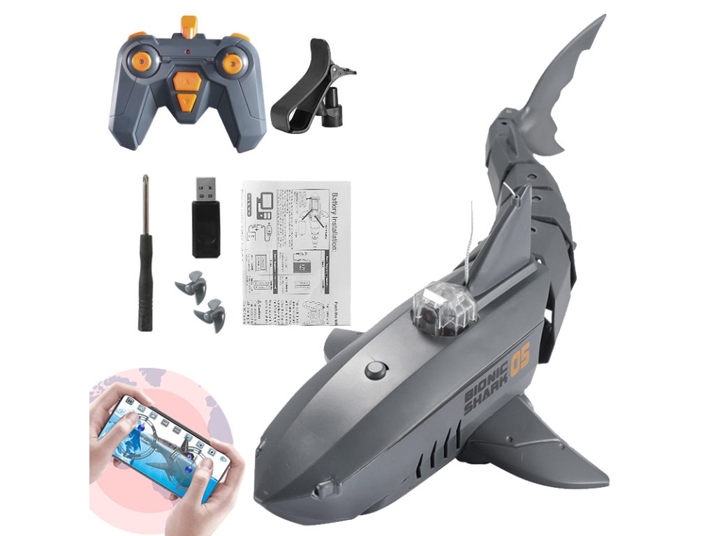 RC Žralok 2.4G (0.3MP Wifi Camera) RC Žralok na dálkovým ovládáním - pluje dopředu i dozadu, doleva a doprava pohybem jeho ocasní části. Baterii uvnitř žraloka lze nabíjet přes USB port. Frekvence: 2,4 GHz Napájení na baterie: žralok: 3,7 V + 350mAh (j