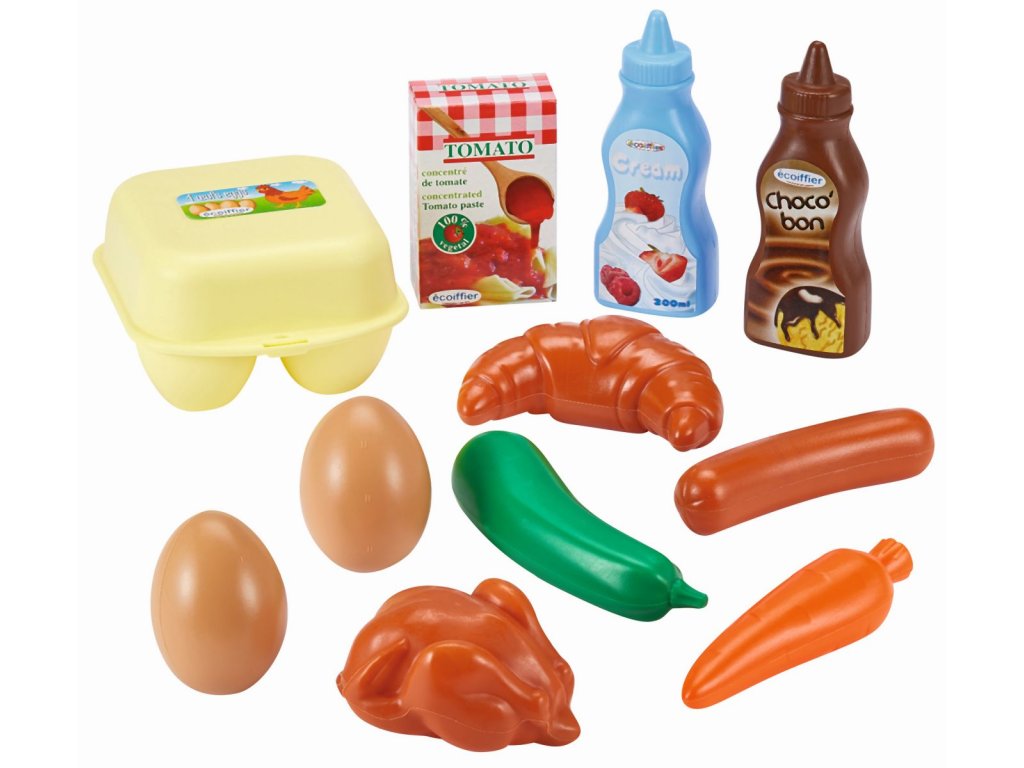 Makety různých potravin, v síťce. S touto sadou máte všechny ingredience pro perfektní snídani. Obsahuje balení vajíček a 2 vejce, kuře, párek, mrkev, okurku, croisant, rajskou omáčku a polevy. Ideální také jako vybavení obchodu nebo jako doplněk do dětské kuchyňky. Rozměry produktu (DxŠxV): 19 x 19 x 13 cm.