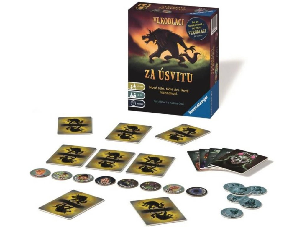 Společenská hra Vlkodlaci: Za úsvitu. Nic pro strašpytly! Dokážete mistrovsky klamat a šálit? Nikdo si na vás nepřijde? Pak jste tu správně! Nové role. Noví vlci. Nová rozhodnutí.