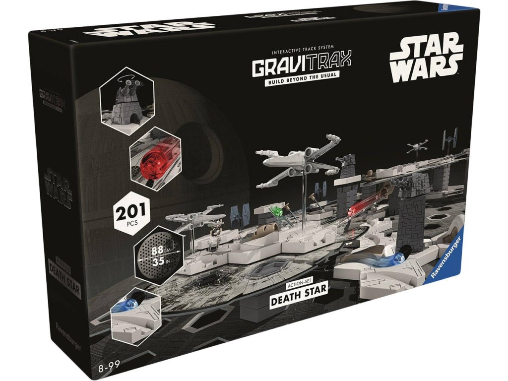 Ponořte se do fascinující galaxie Star Wars s prvky speciálně upravenými do podoby Star Wars. Výškové desky ve tvaru legendárních vesmírných lodí, zakřivené kostky s charakteristickými strukturami Hvězdy smrti a mnoho akčních prvků v nových barvách dělají z dráhy GraviTrax epické dobrodružství.