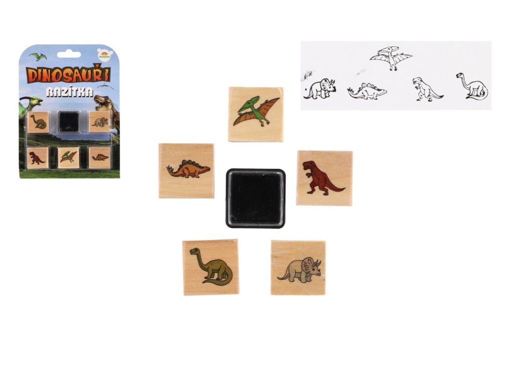 Razítka dřevěná 5+1 s poduškou dinosauři 3x3cm na kartě
