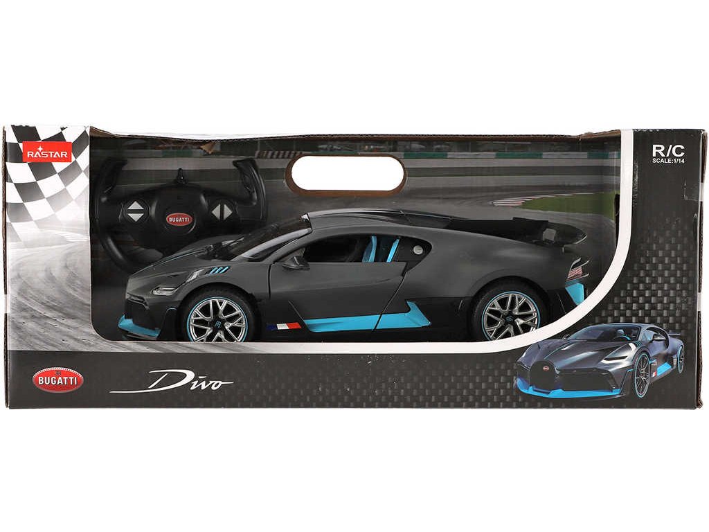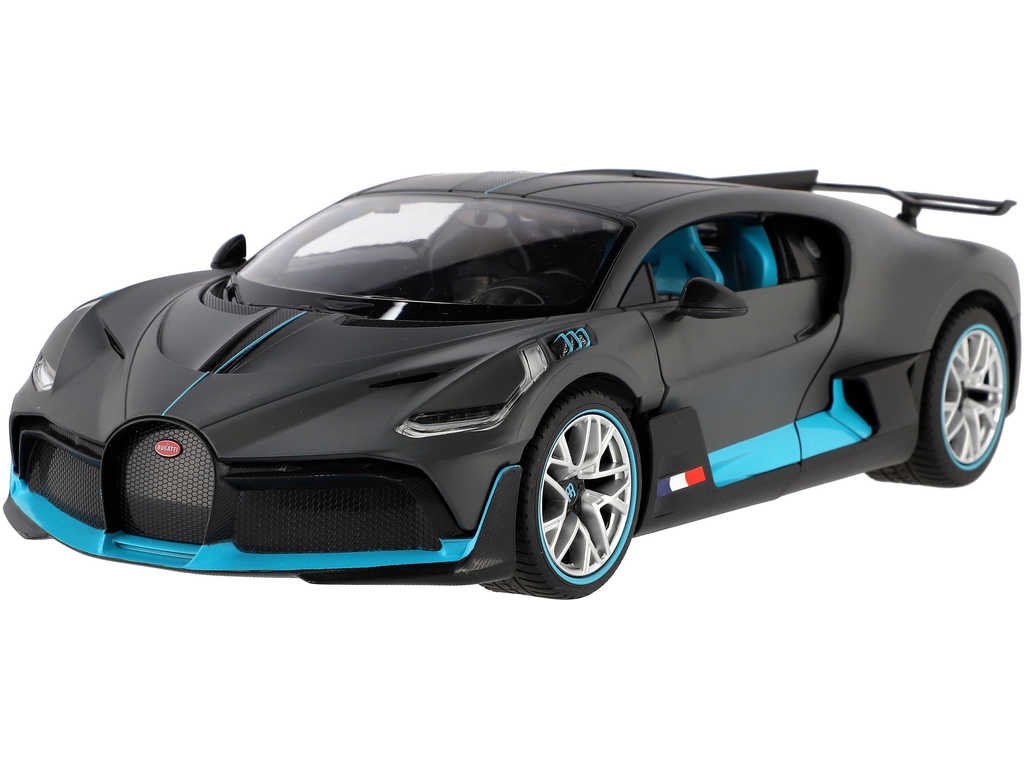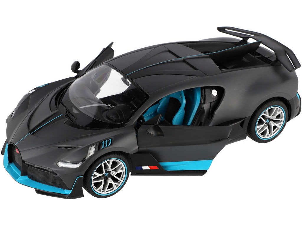 Krásný RC model auta Buggatti Divo v šedé barvě s modrými prvky. Jedná se o propracovaný model s plastovými doplňky, auto má otevírací dveře. Auto je na dálkové ovládání ve tvaru