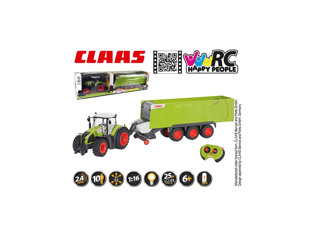 Traktor s přívěsem na dálkové ovládání s frekvencí 2,4 GHz. Souprava jezdí rychlostí 3 km/h na vzdálenost až 25 metrů. Plná funkce řízení a řazení. Obsahuje světlo a tažné zařízení. Baterie 4xAA, ovladač 2x AAA. Baterie jsou součástí balení. Vhodné pro děti od 6 let.